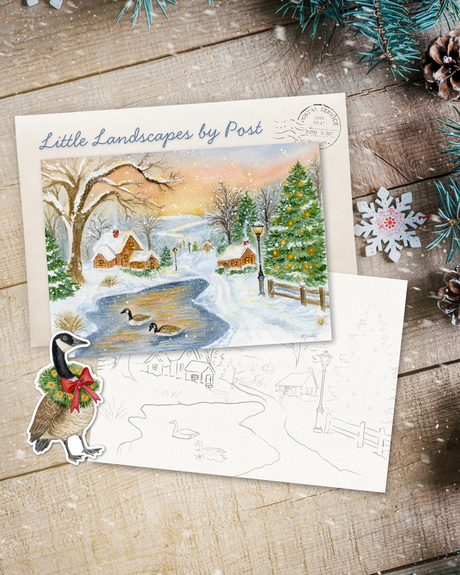 Each month, a new 5×7 fine art landscape print, a line drawing on watercolor paper and a surprise sticker arrives quietly in your mailbox.