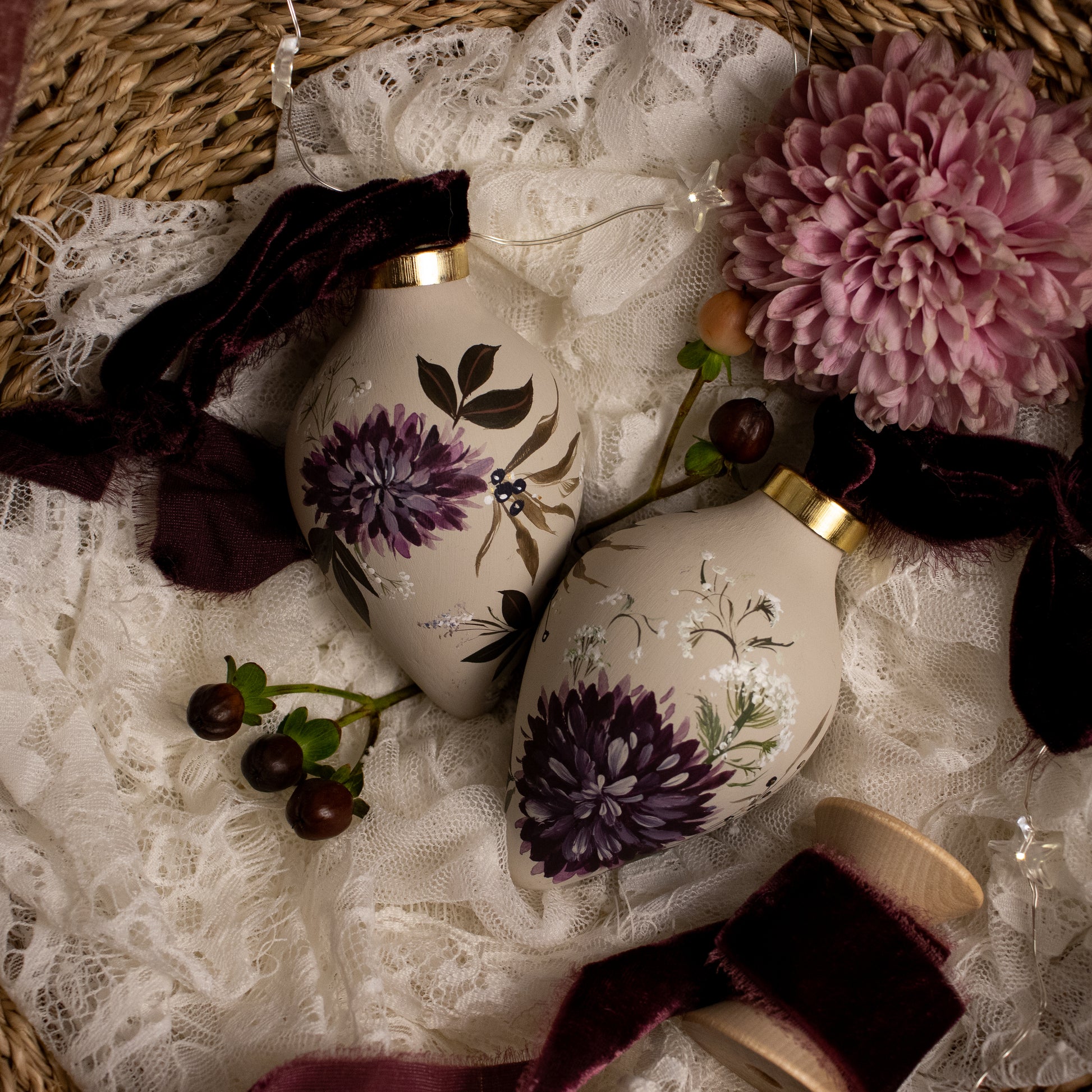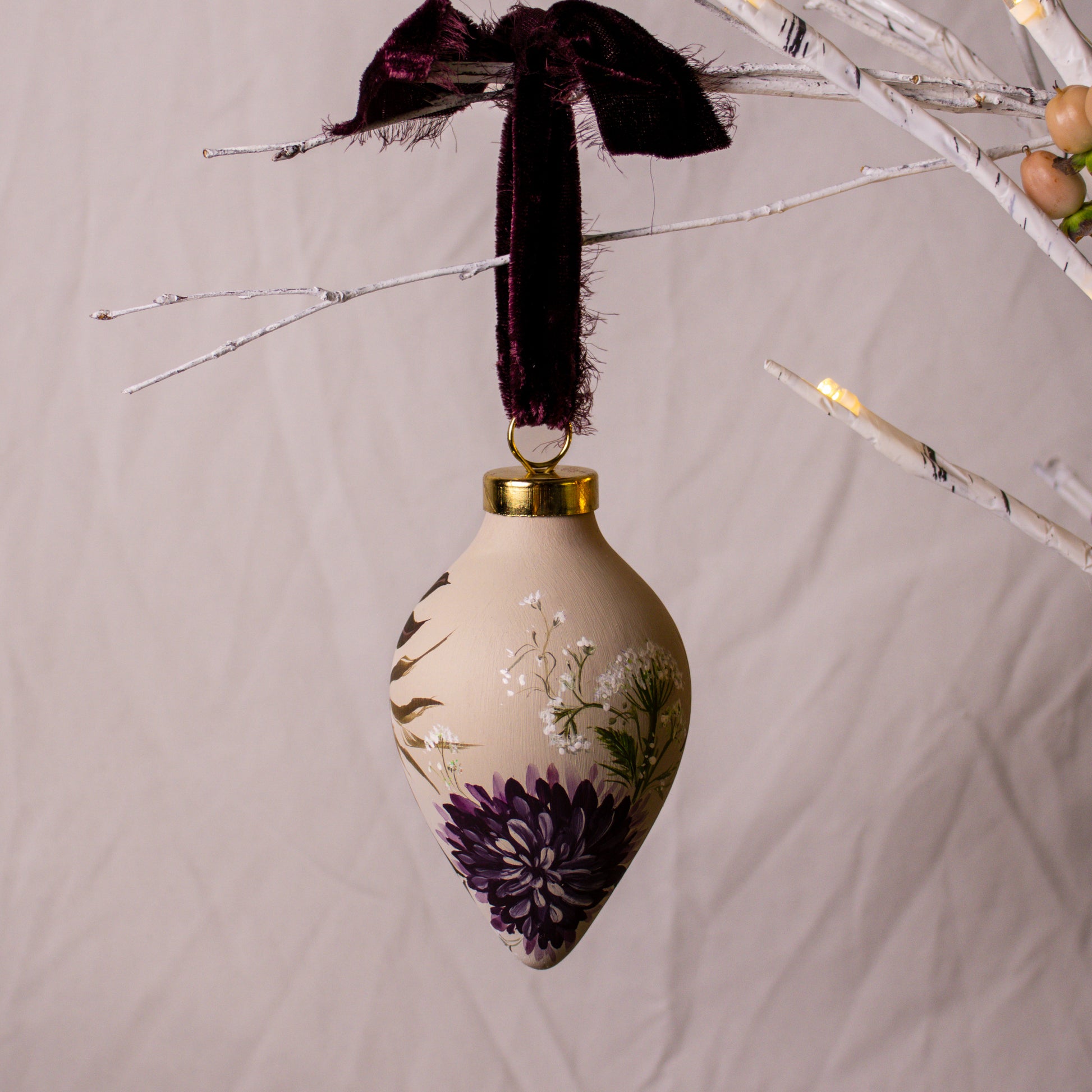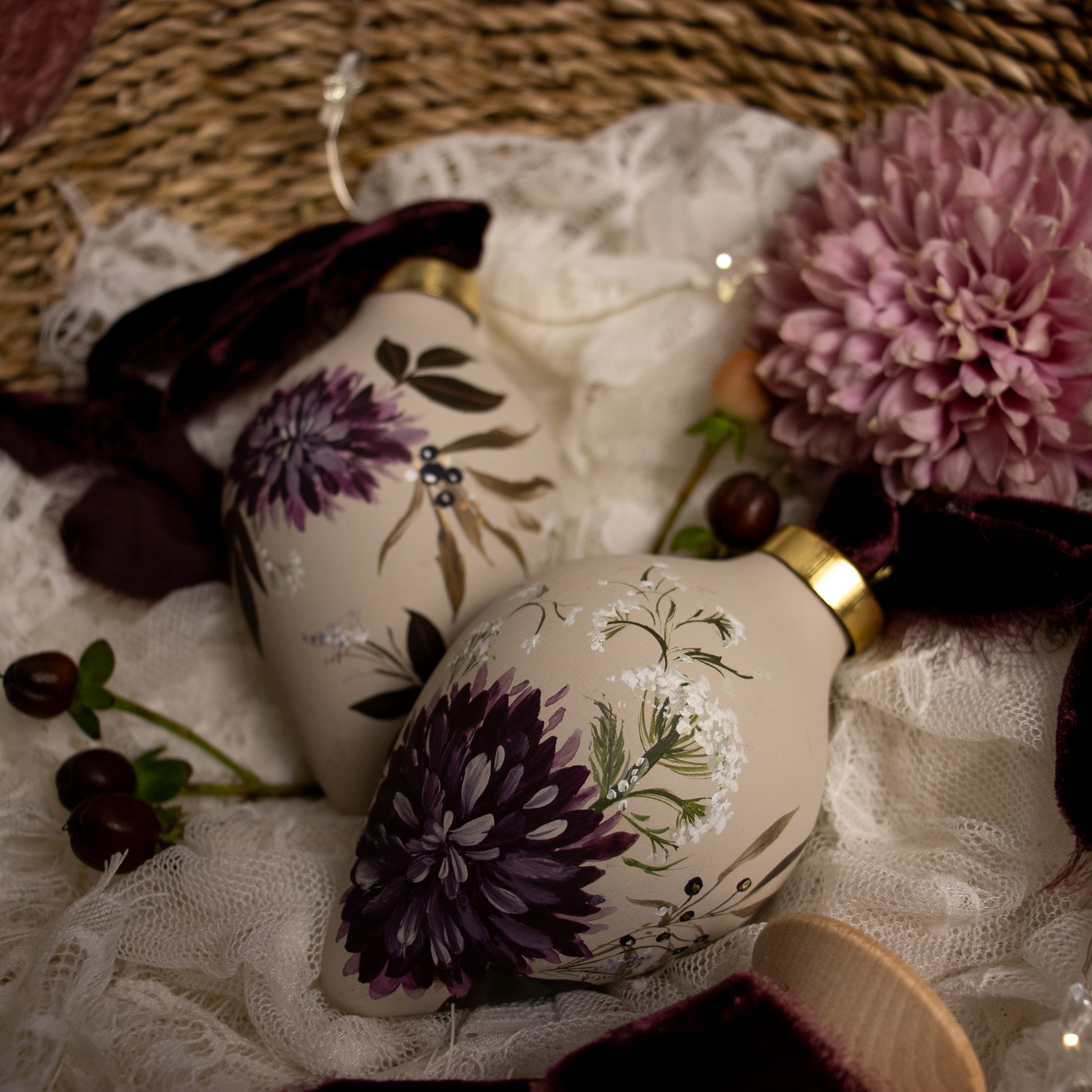Bring beautiful nature directly to your home! This Hand painted ornament features a stunning black dahlia, delicate Queen Anne's Lace, and winter berries, this heirloom-quality piece is truly one-of-a-kind. The organic, flowing botanicals and hints of shimmering gold evoke a sense of luxury and grace. Tied delicately with a black cherry silk ribbon, this Neutral Round Shaped Ceramic Ornament exudes elegance and sophistication, making it a true masterpiece.