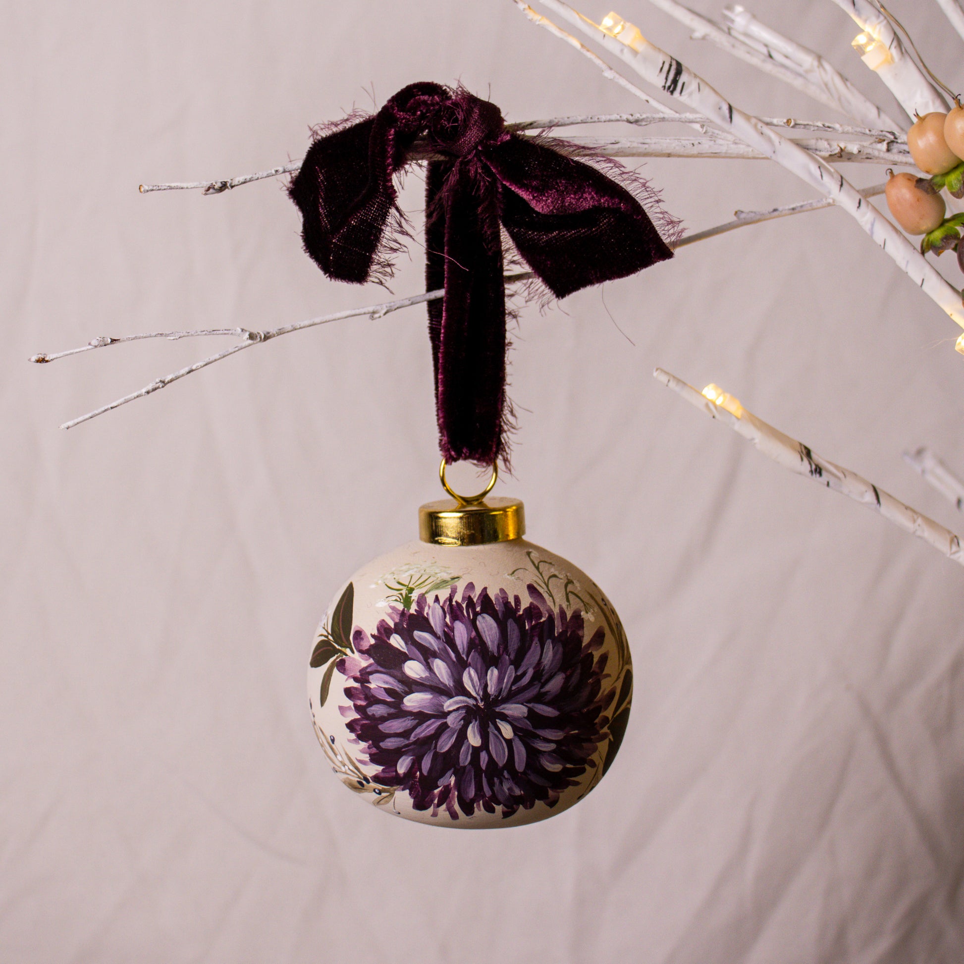 Bring beautiful nature directly to your home! This Hand painted ornament features a stunning black dahlia, delicate Queen Anne's Lace, and winter berries, this heirloom-quality piece is truly one-of-a-kind. The organic, flowing botanicals and hints of shimmering gold evoke a sense of luxury and grace. Tied delicately with a black cherry silk ribbon, this Neutral Round Shaped Ceramic Ornament exudes elegance and sophistication, making it a true masterpiece.