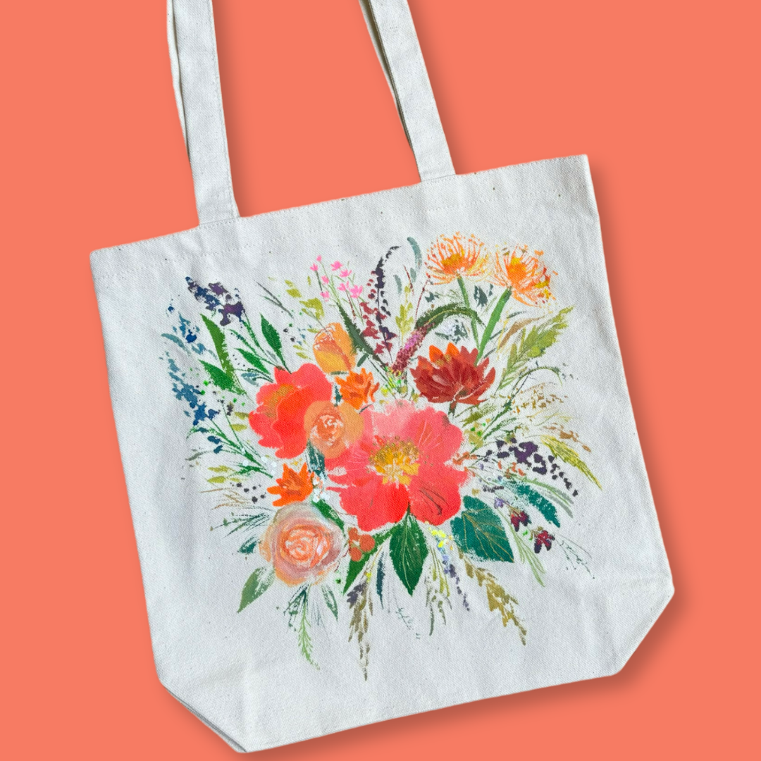 Spice up your to-do list with our one-of-a-kind Hand-painted Blooms Canvas Tote 1. This tote is the perfect blend of practicality and fashion, boasting charming hand-painted flowers that are sure to turn heads. Carry your must-haves with flair and whimsy, featuring vibrant peonies, roses, and other playful blooms crafted with acrylic ink.