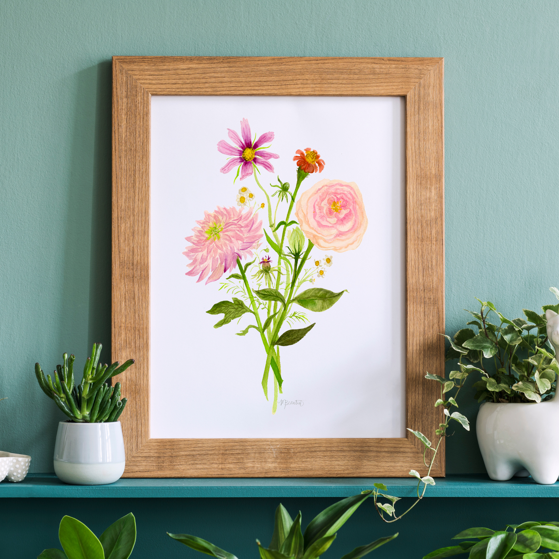 Indulge in the soft, bohemian colors of this floral bouquet watercolor art print. Featuring roses, cosmos, dahlias, zinnias Perfect for nature lovers and those seeking a peaceful and serene ambiance.