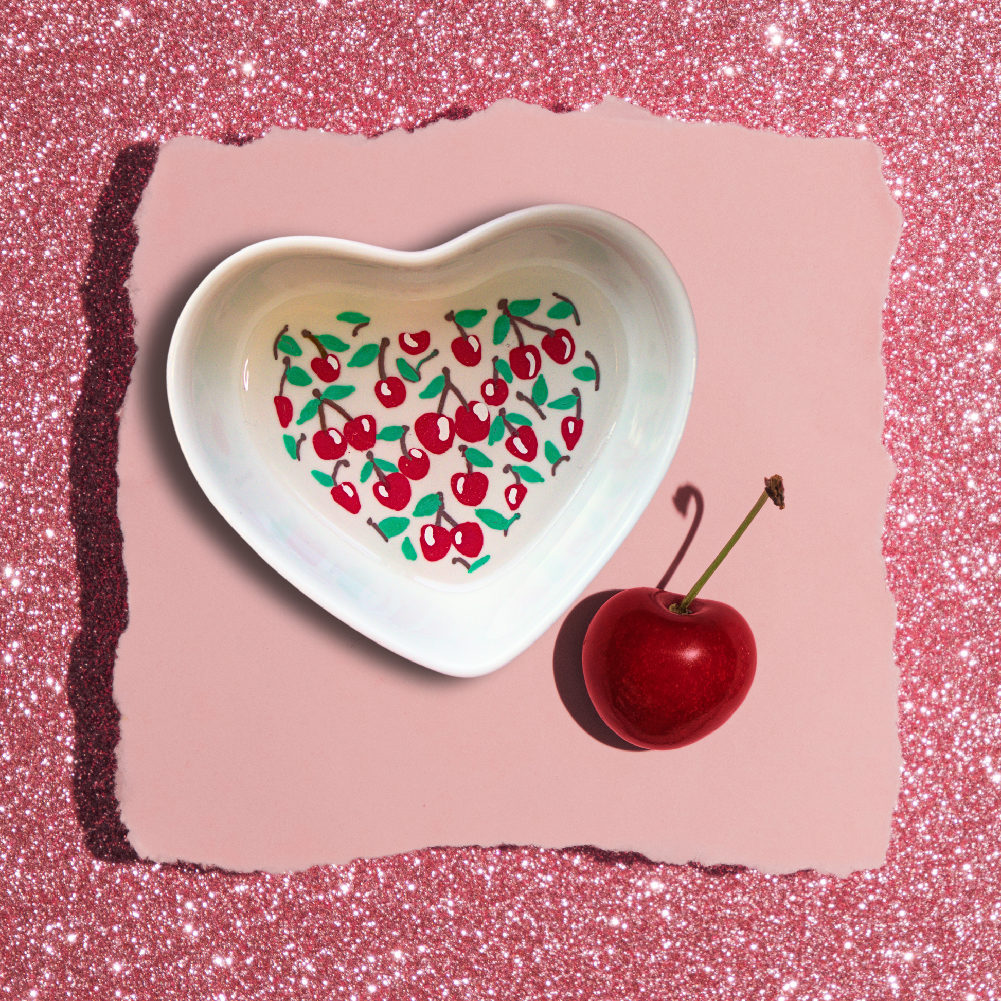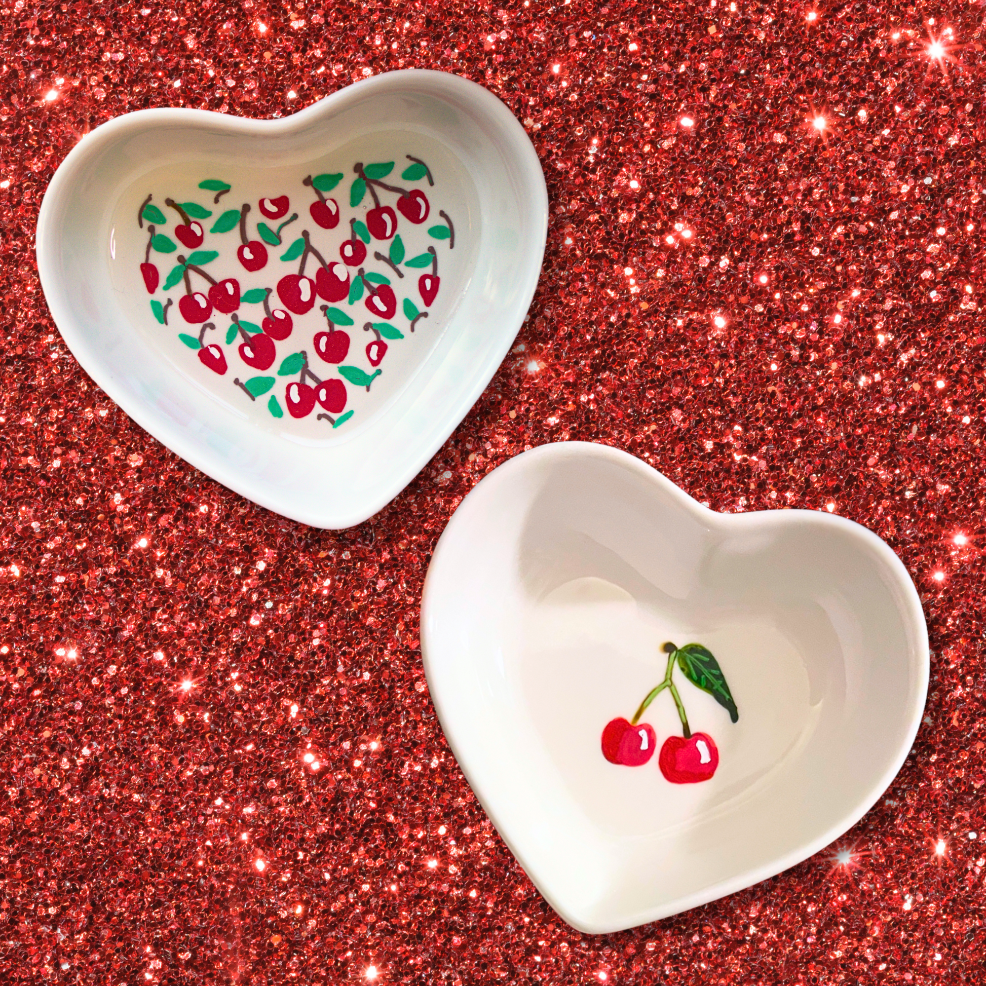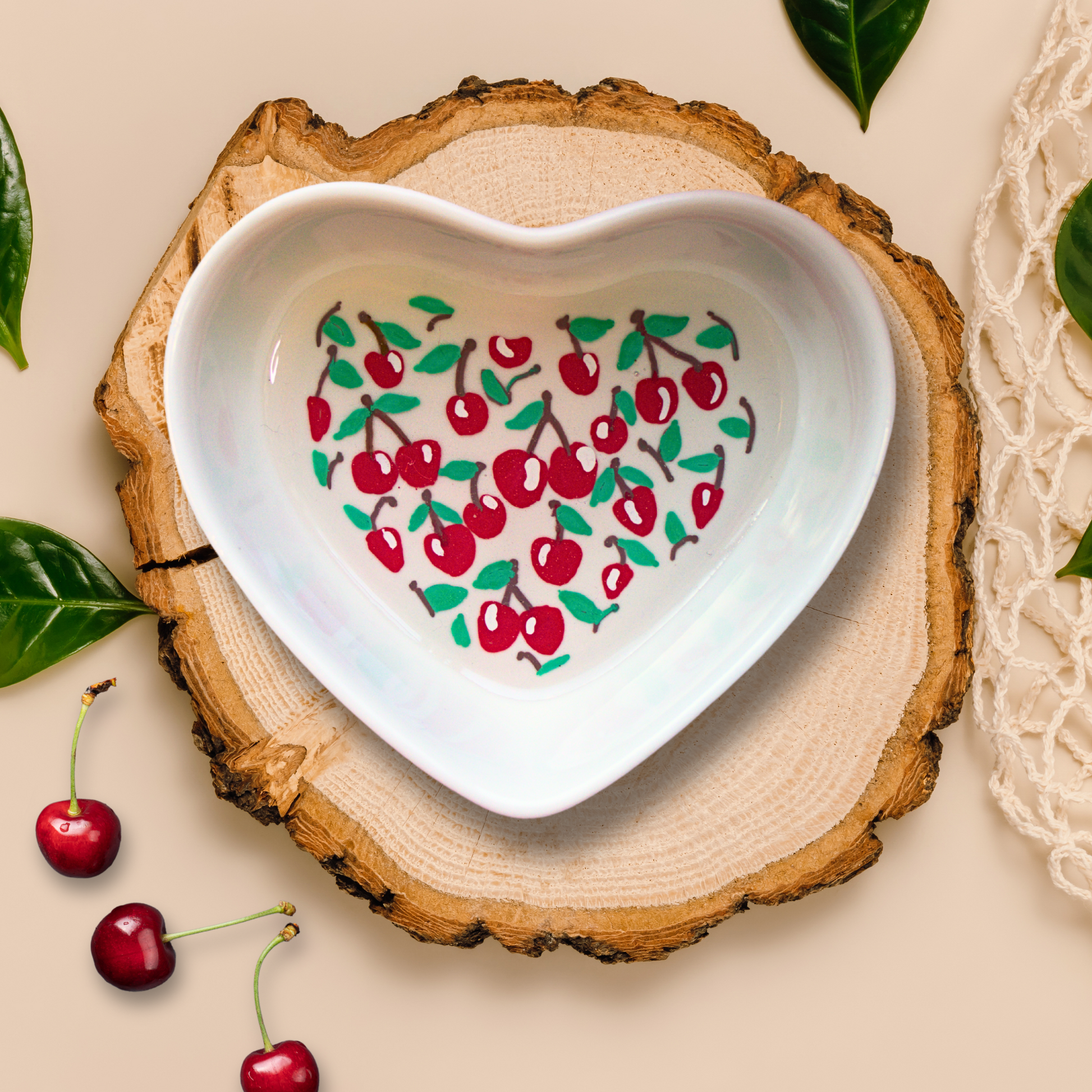 Add some sweetness to your life with our Cherry Pattern Ceramic Trinket Dish! This heart-shaped dish features a charming cherry pattern, sealed with resin for durability. Perfect for storing rings, jewelry, crystals, and other trinkets. A perfect gift for your loved ones. 🍒
