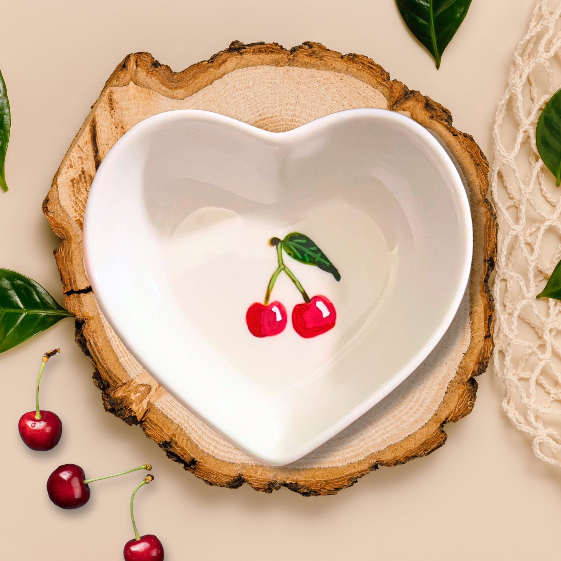 Add some sweetness to your life with our Cherry Ceramic Trinket Dish! This heart-shaped dish features a charming cherry pattern, sealed with resin for durability. Perfect for storing rings, jewelry, crystals, and other trinkets. A perfect gift for your loved ones. 🍒