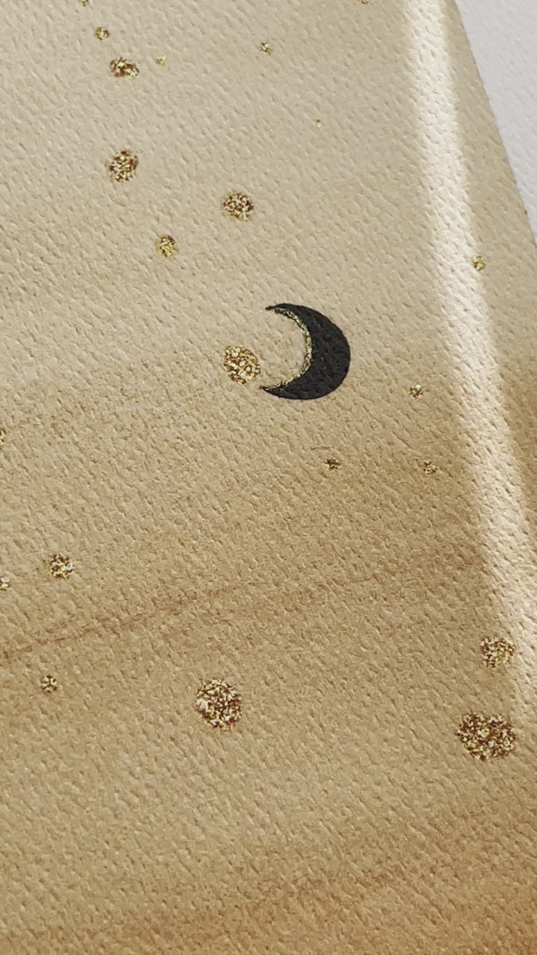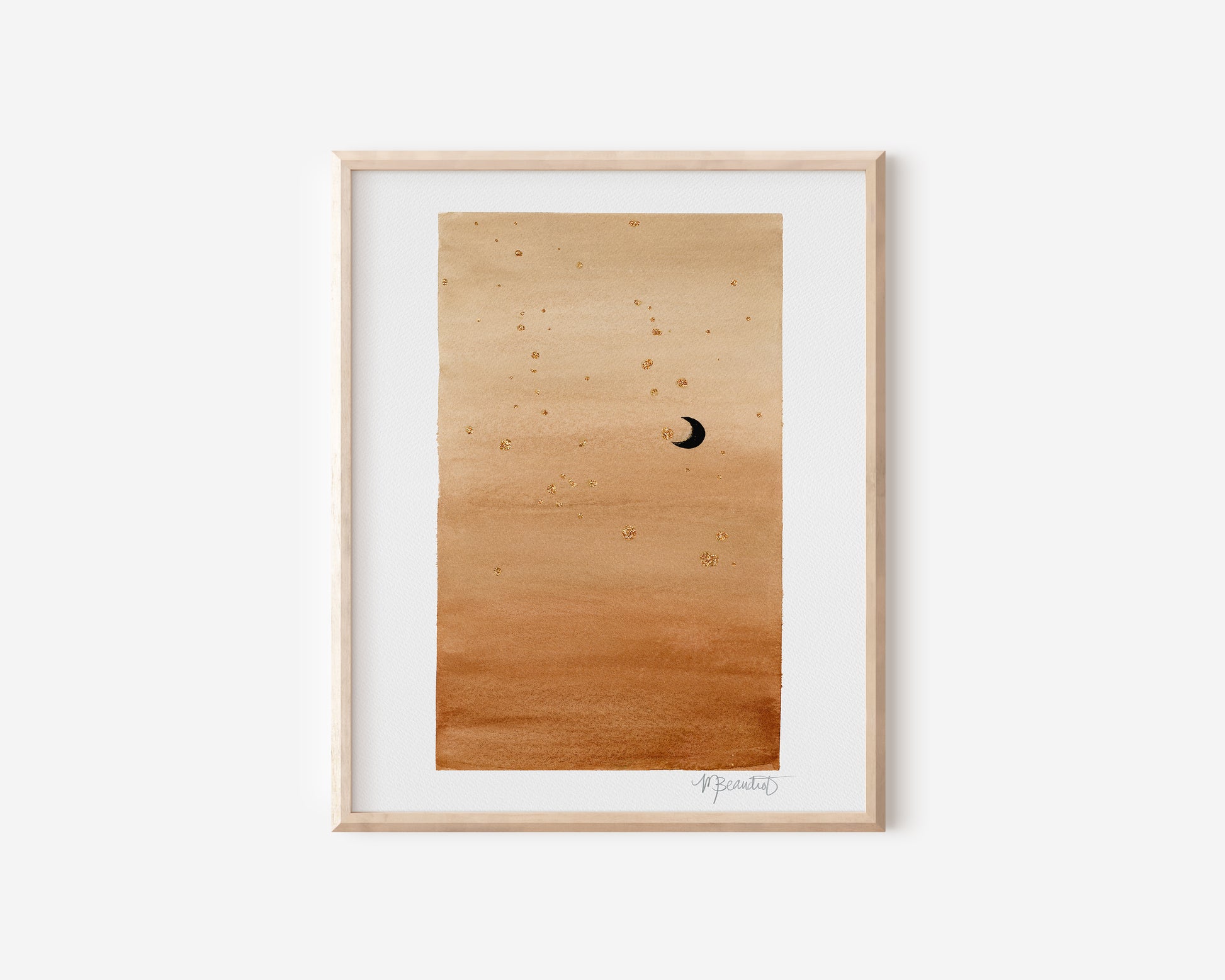 This beautiful watercolor painting depicts a serene crescent moon with delicate metallic accents. The subtle brushstrokes and shimmering accents create a tranquil atmosphere that will bring a sense of calmness to any space. The muted colors create an understated elegance that will add a touch of sophistication to any home. This painting is sure to be a conversation starter and provide a peaceful spot to rest your eyes.