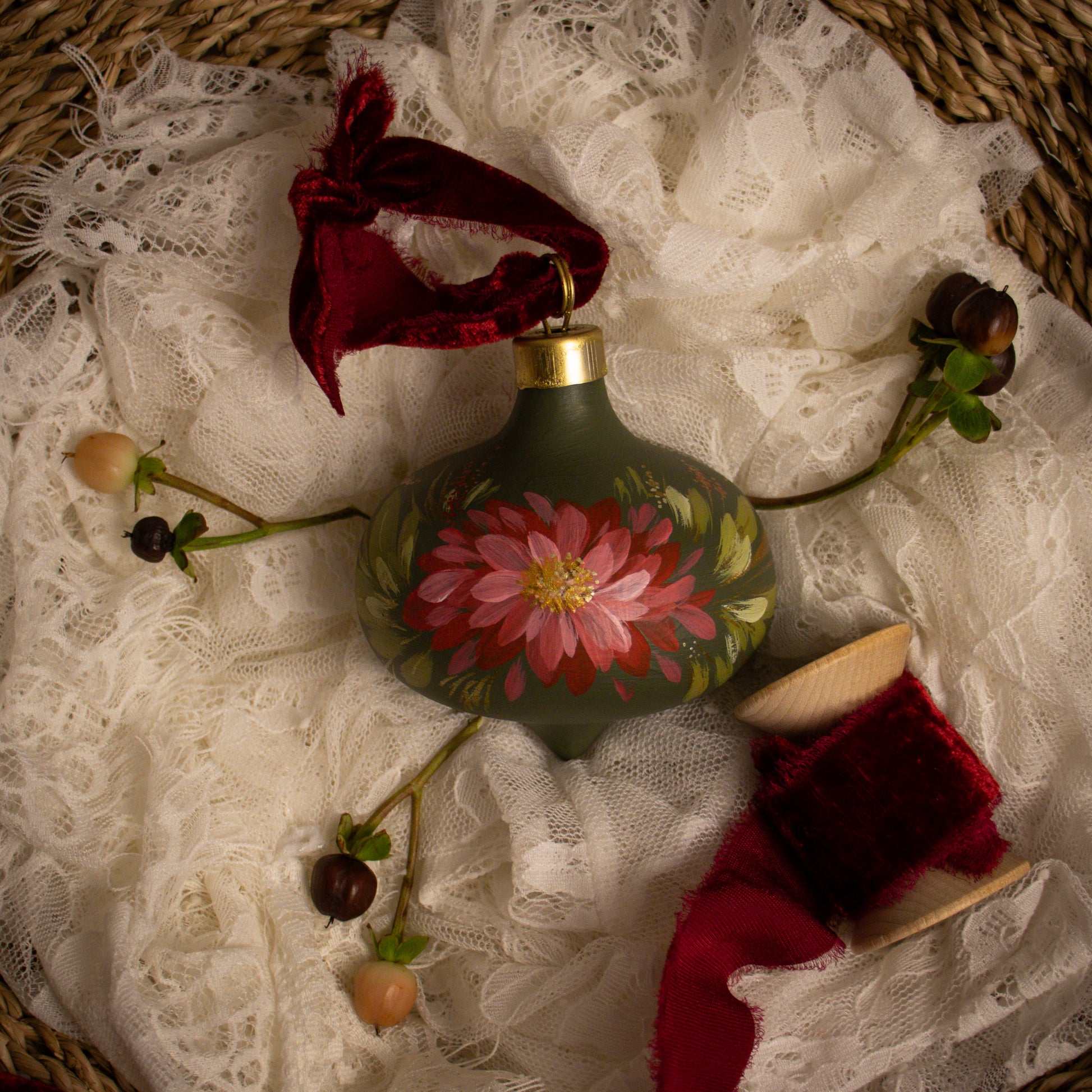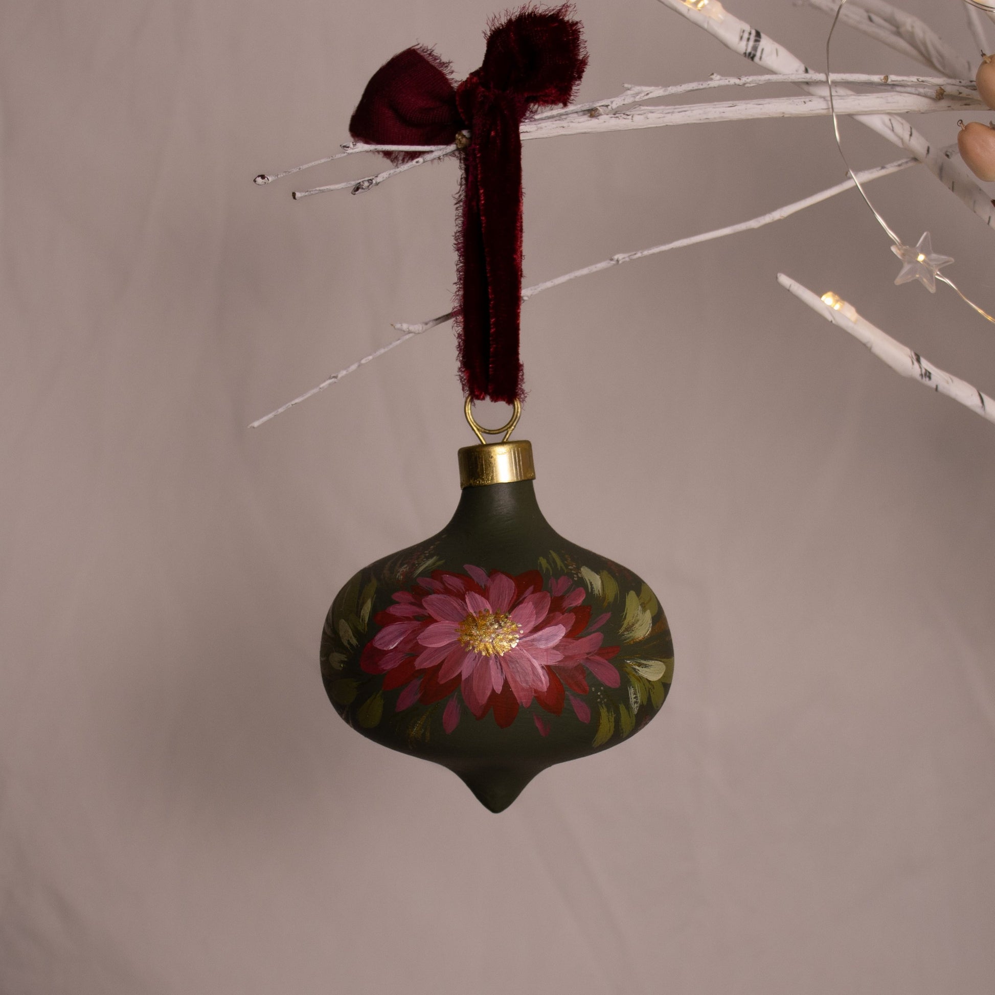 Add a touch of elegance to your holiday decor with our Crimson Blooms in Verte Retro Shaped Ceramic Ornament. Handpainted with rich crimson winter florals and gilded with metallic accents, this one-of-a-kind ornament is a true heirloom piece. The ruby velvet silk ribbon adds a luxurious finishing touch.