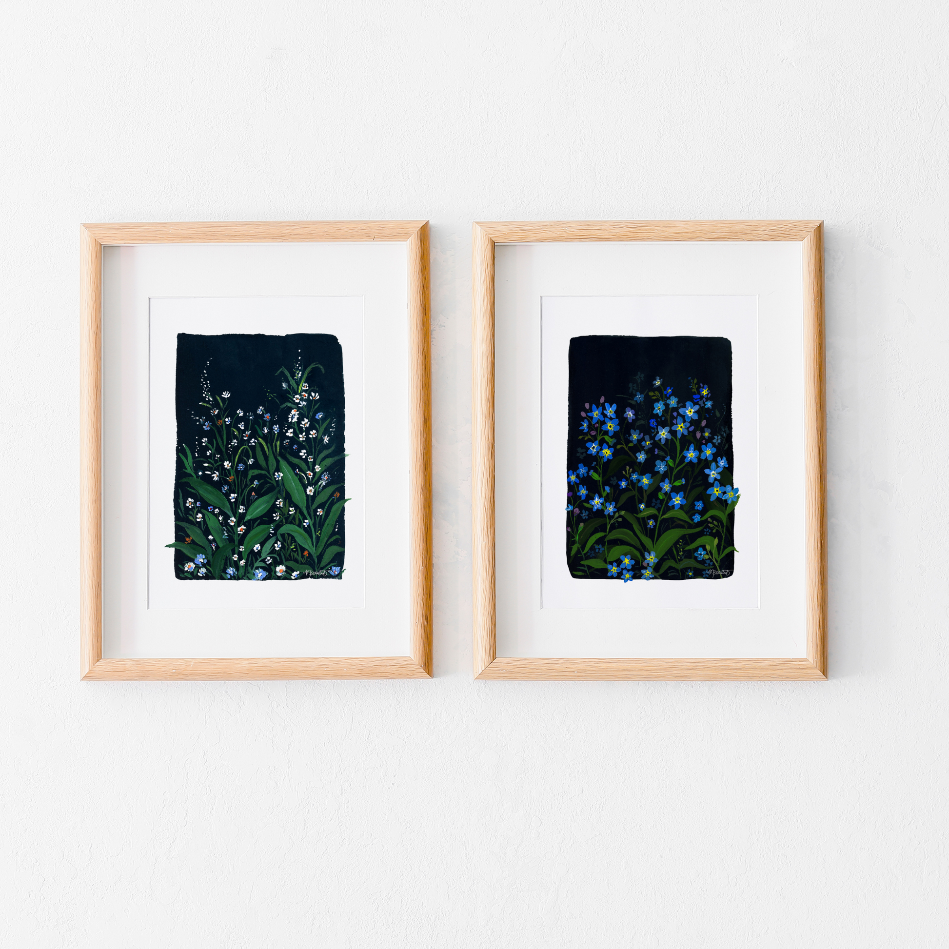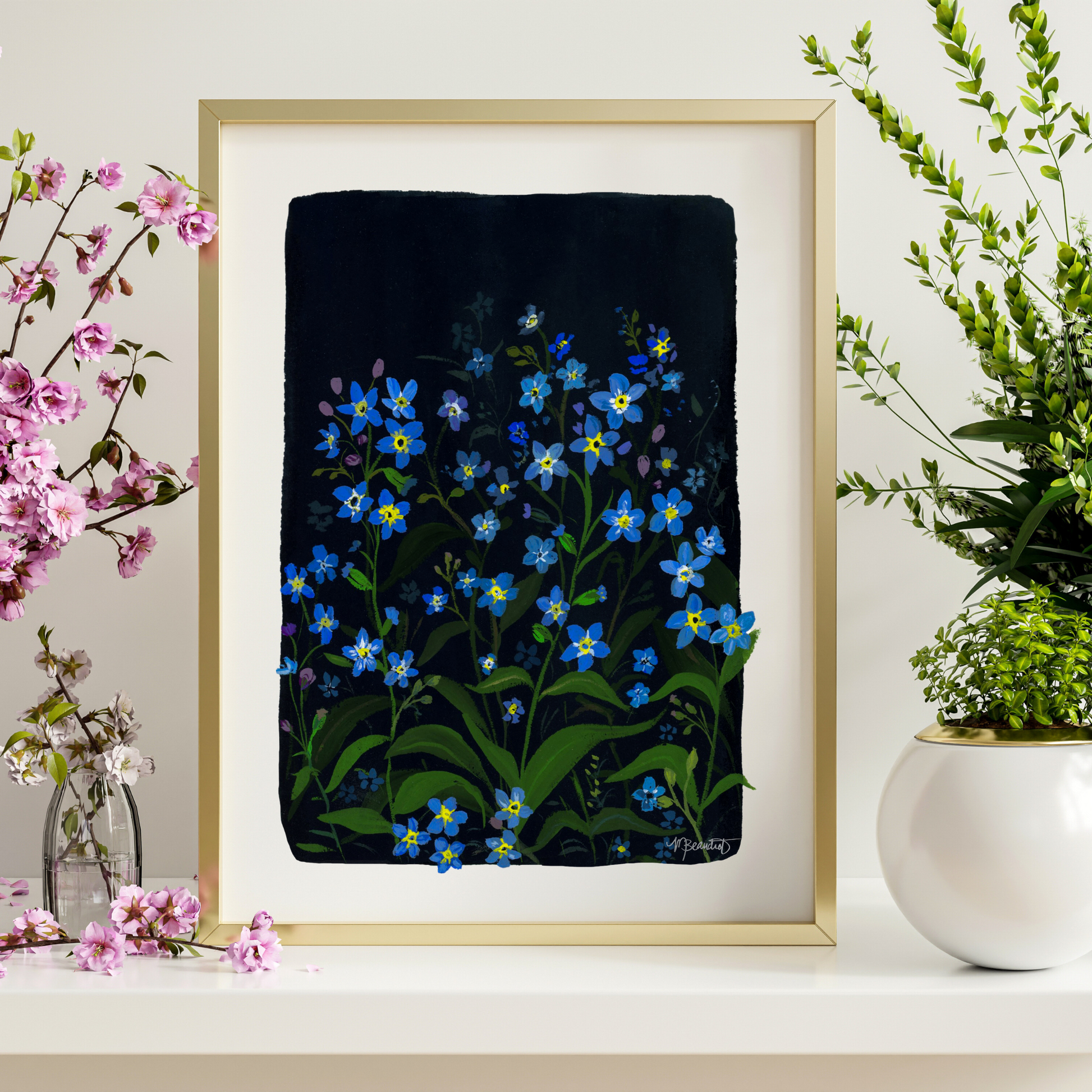 Forget me Nots In Dark Navy Moody Floral Gouache Art Print