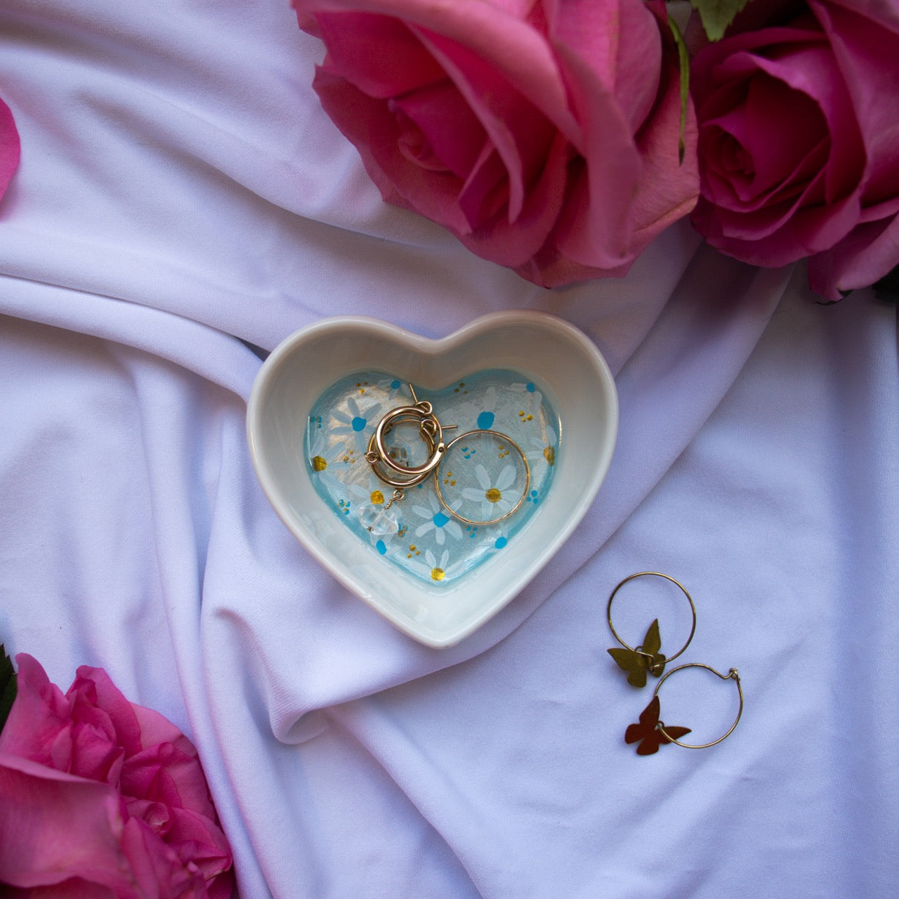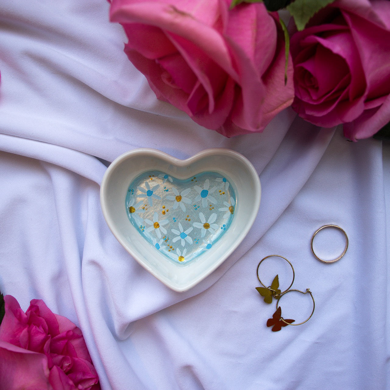 Add a touch of whimsy to your dresser or vanity with this adorable trinket dish. Hand painted with daisies in a metallic baby blue with hints of gold ceramic dish, it's the perfect place to store your small treasures.