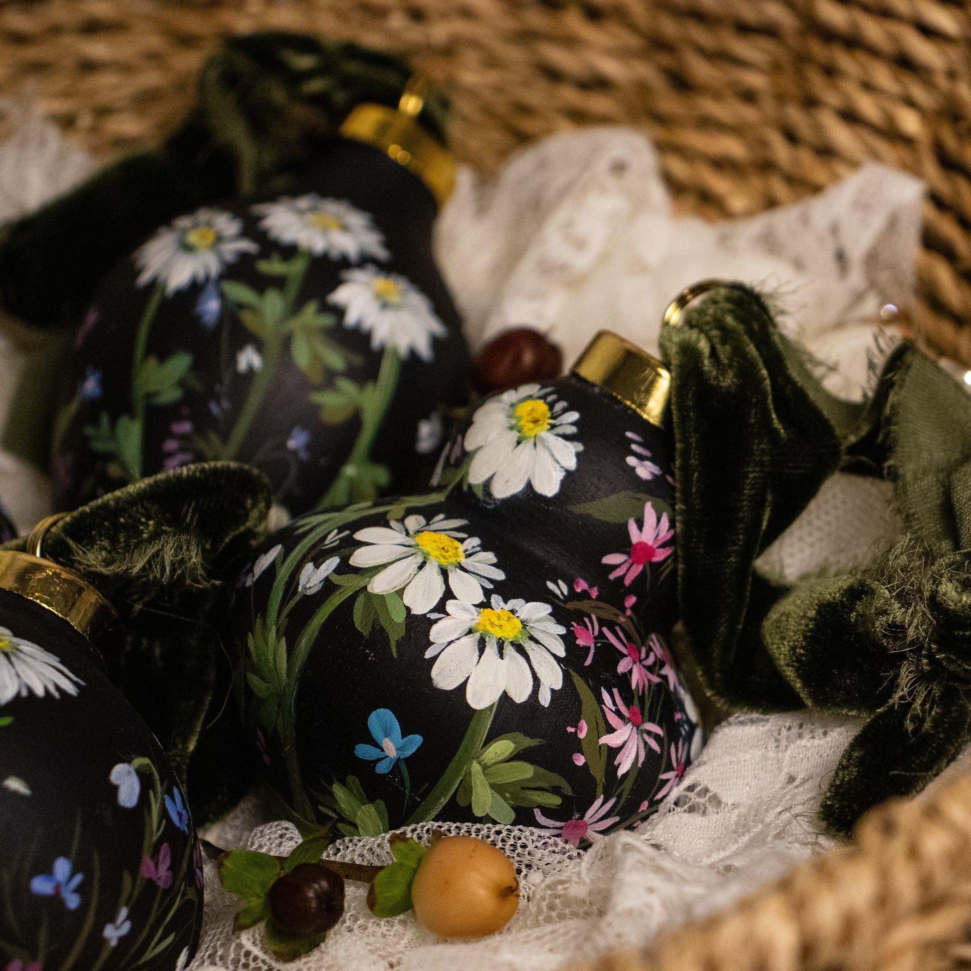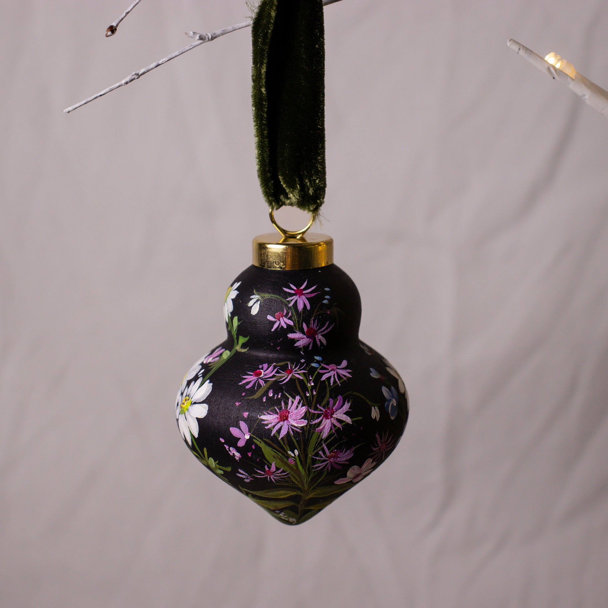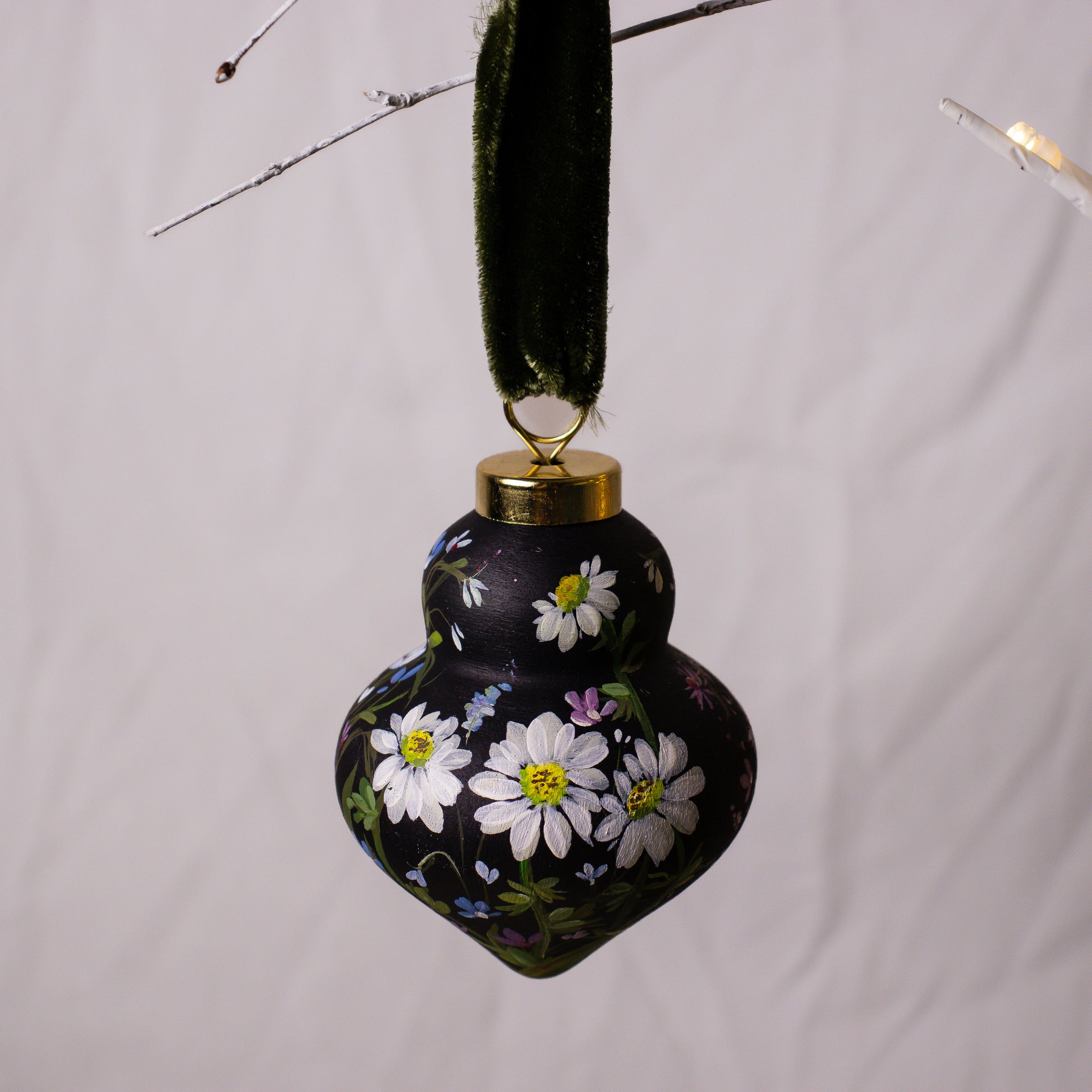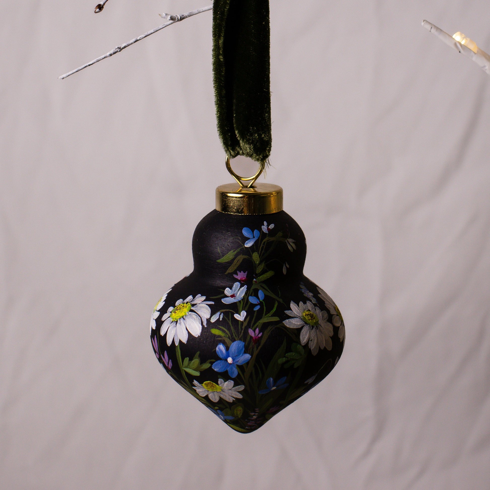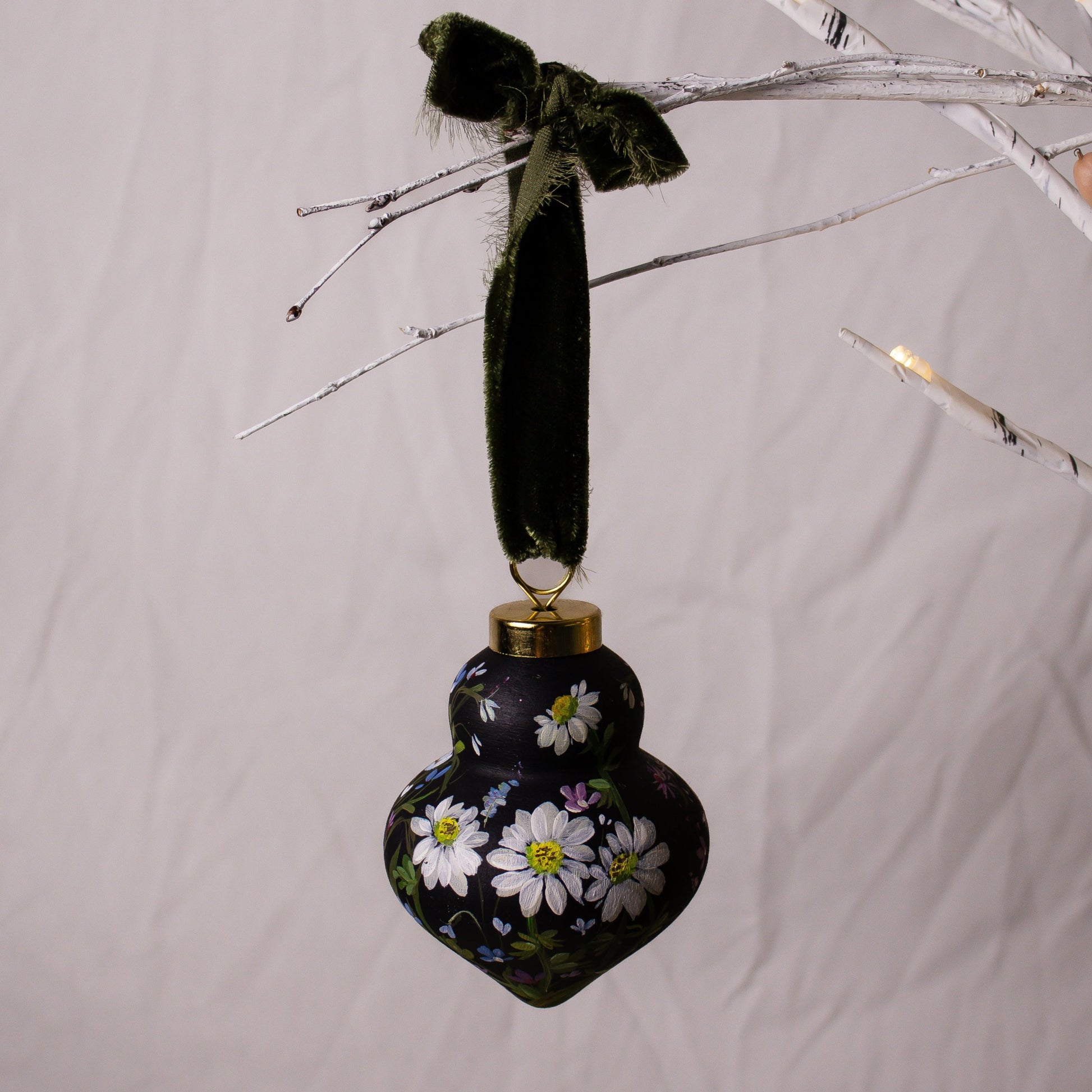 Discover a beloved collector's item, Enjoy the beauty of nature with our Daisies in Dark Navy Finial Shaped Ceramic Ornament. Intricately hand painted and adorned with Daisies, Asters, & Wildflowers in a deep dark navy, this exquisite ornament is a coveted treasure. Finished with a lush forest green velvet silk ribbon, it's a necessary addition to your cherished collection.