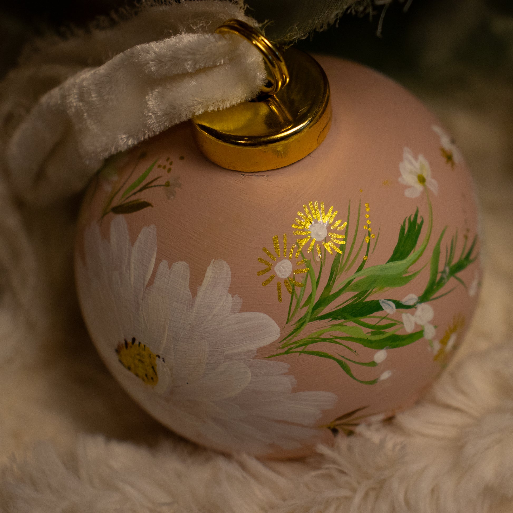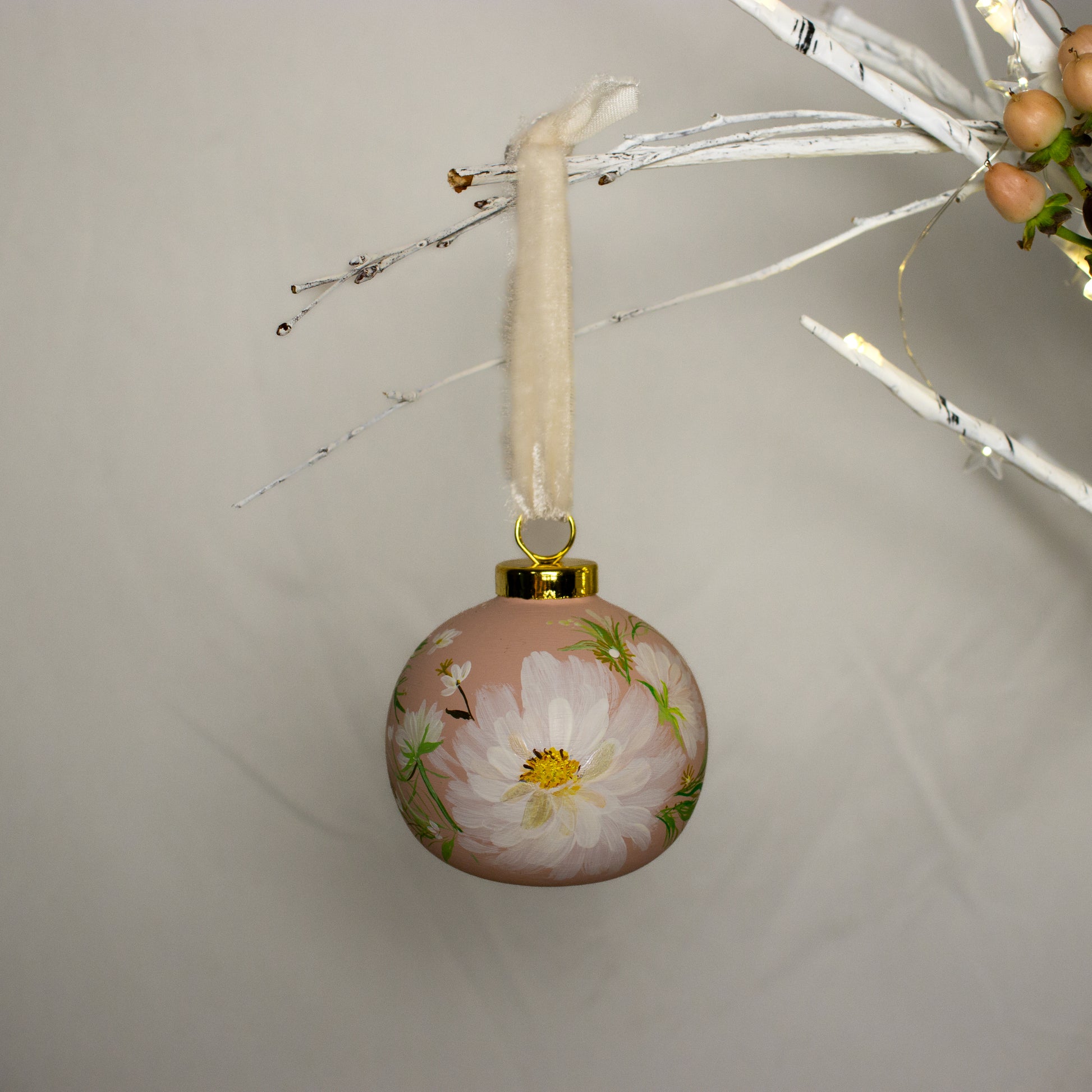 Add a touch of luxury to your decor with our Cosmos in Blush Round Shaped Ceramic Ornament. This one-of-a-kind heirloom piece features hand-painted cosmo flowers, golden daisies, and wildflowers in a stunning blush color. Display it on your tree or as a beautiful decoration year-round.