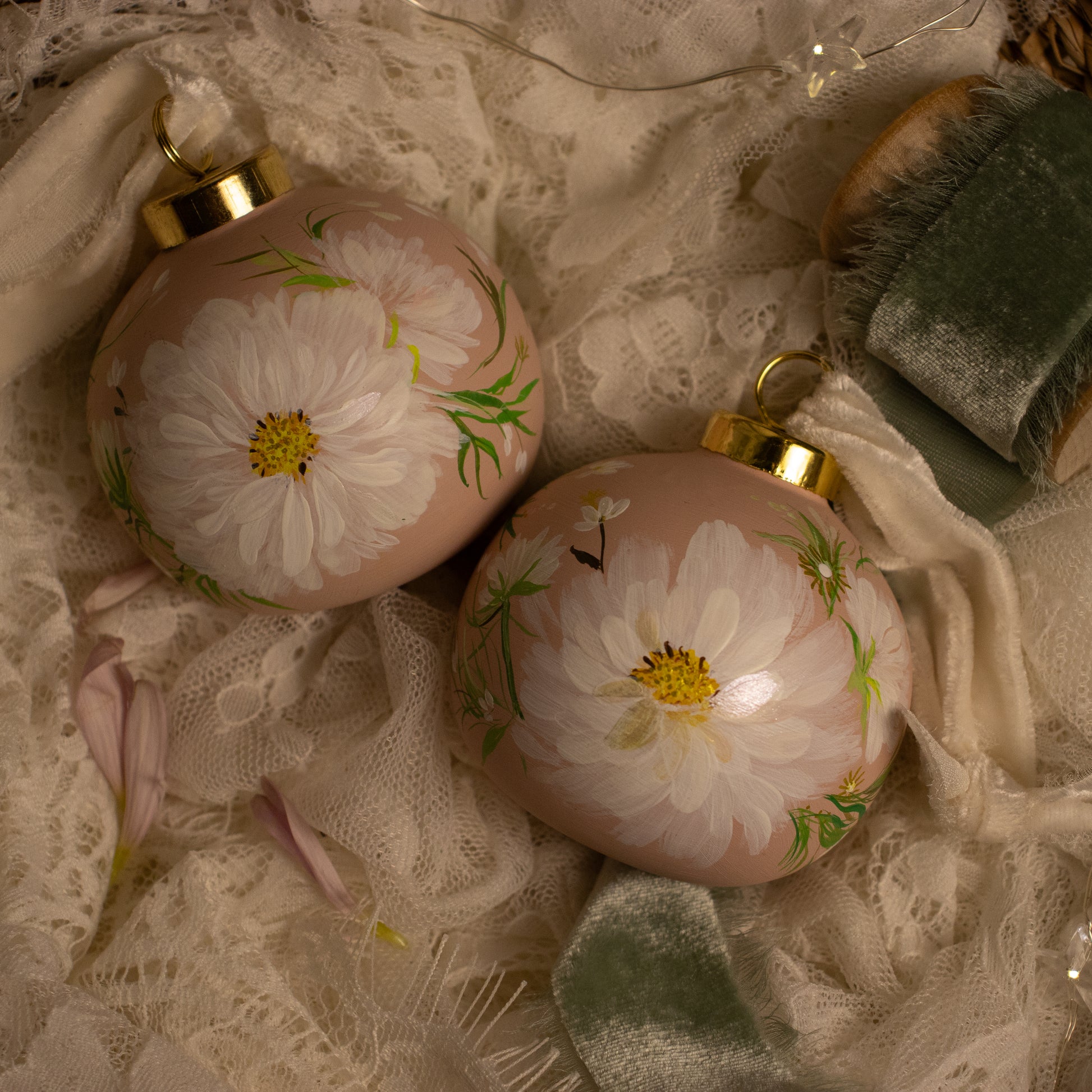 - hand-painted ceramic ornaments, adorned with real silk velvet ribbon and metallic touches.