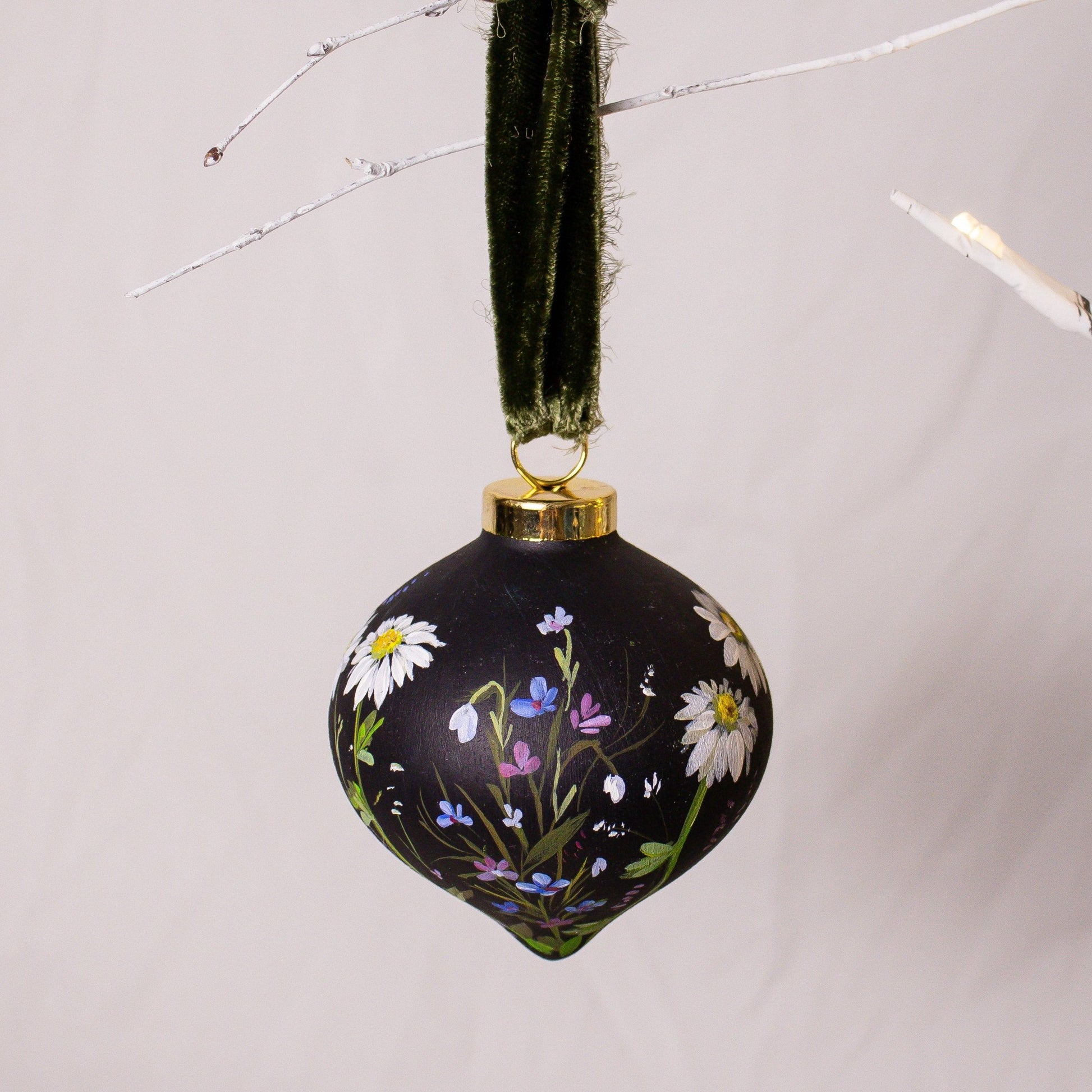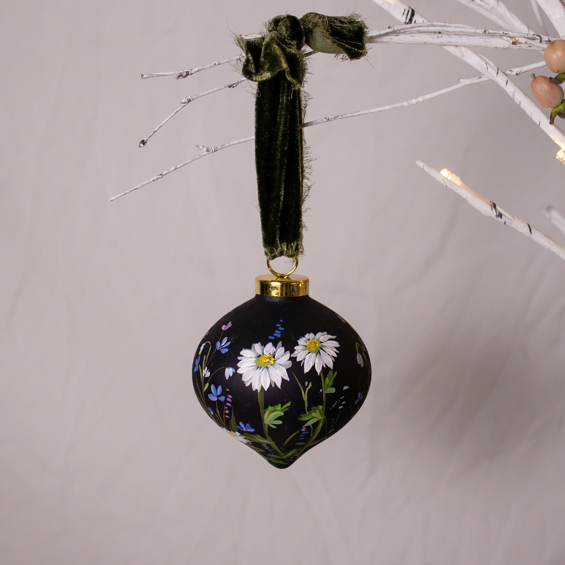 Discover a beloved collector's item, Enjoy the beauty of nature with our Daisies in Dark Navy Retro Shaped Ceramic Ornament. Intricately hand painted and adorned with Daisies, Asters, & Wildflowers in a deep dark navy, this exquisite ornament is a coveted treasure. Finished with a lush forest green velvet silk ribbon, it's a necessary addition to your cherished collection.
