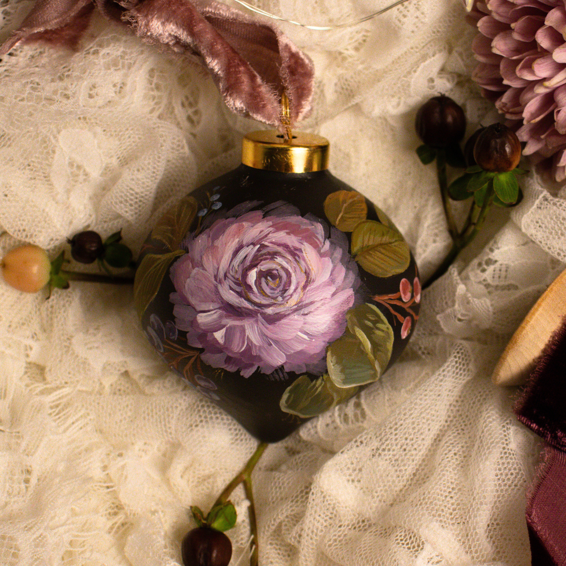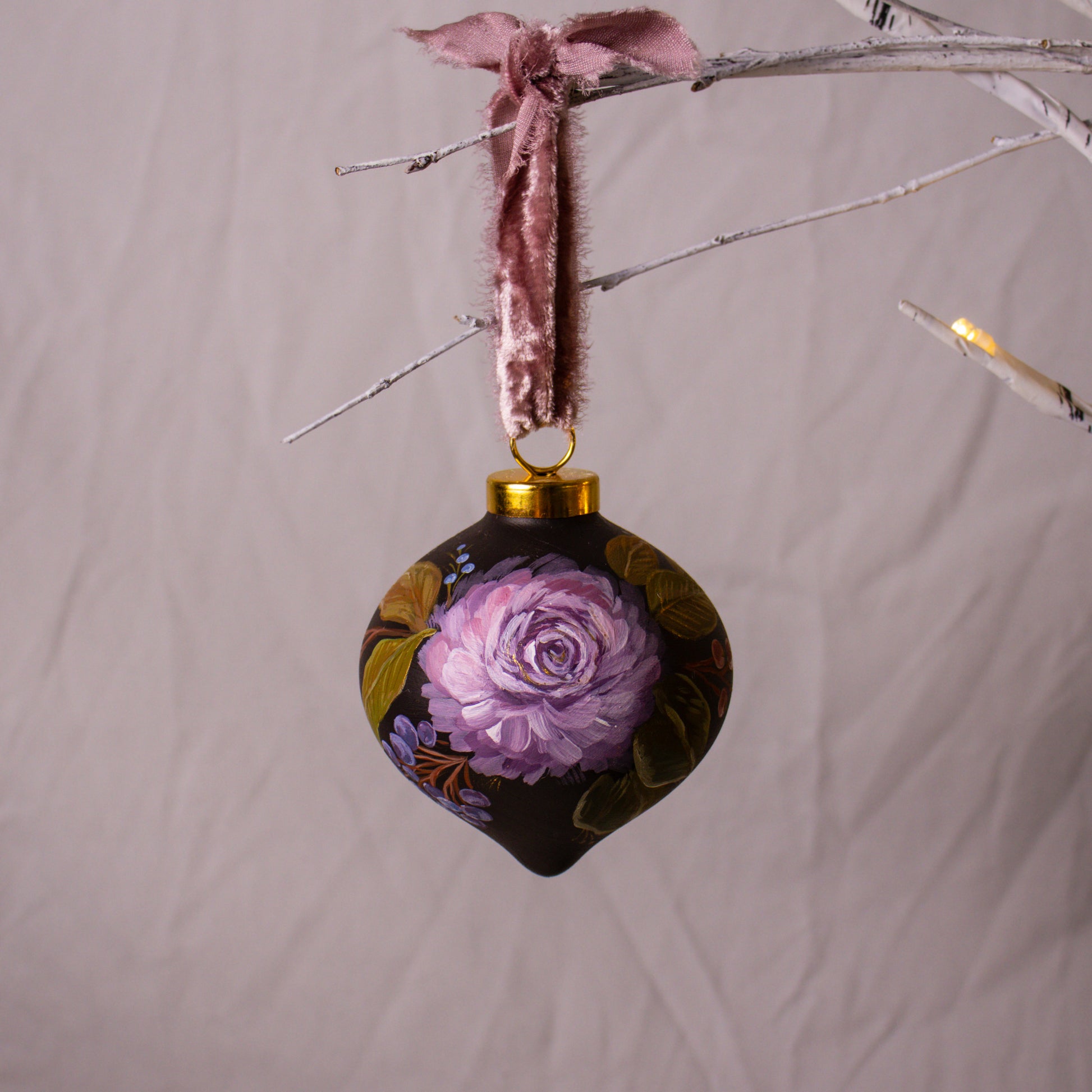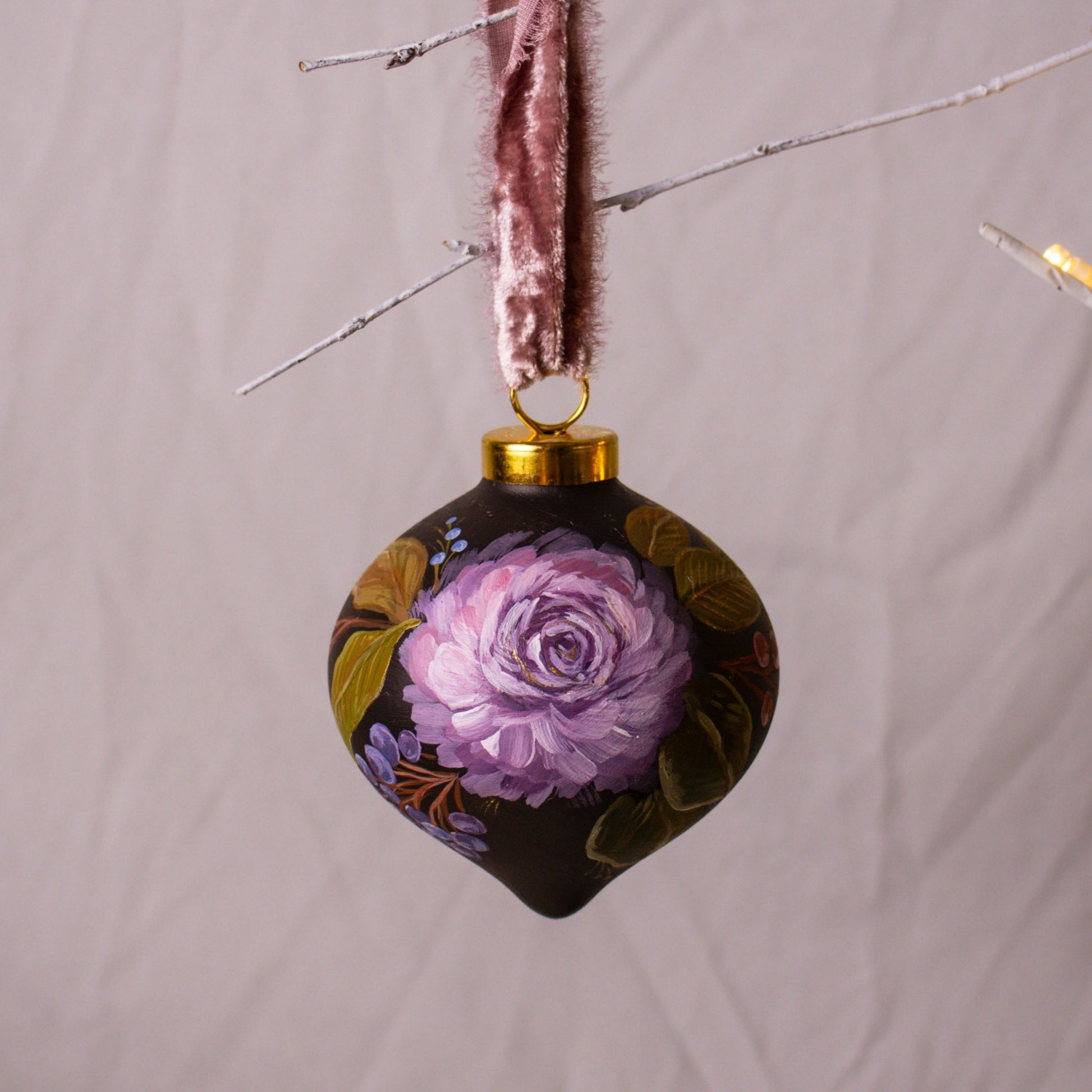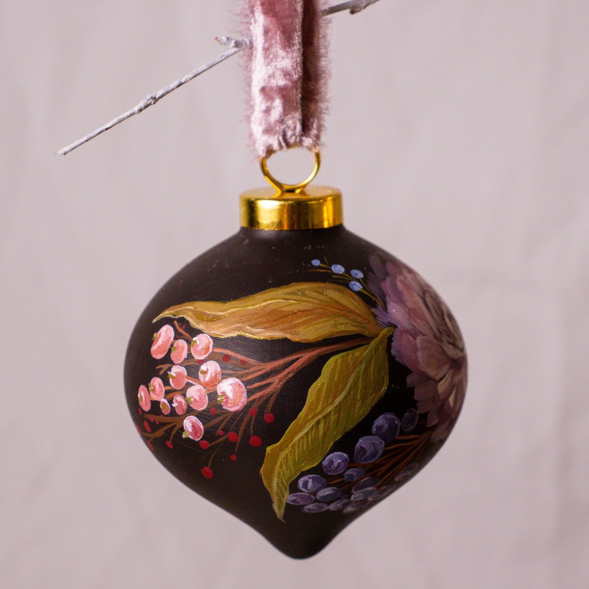 Elevate your holiday decor with our Dusty Rose in Nocturne Retro Shaped Ceramic Ornament. Featuring hand-painted vintage roses and winter berries on a rich dark brown background, this unique ornament is a collector's dream. Made with luxurious dusty rose velvet silk, it adds a touch of moody elegance to your festive display.