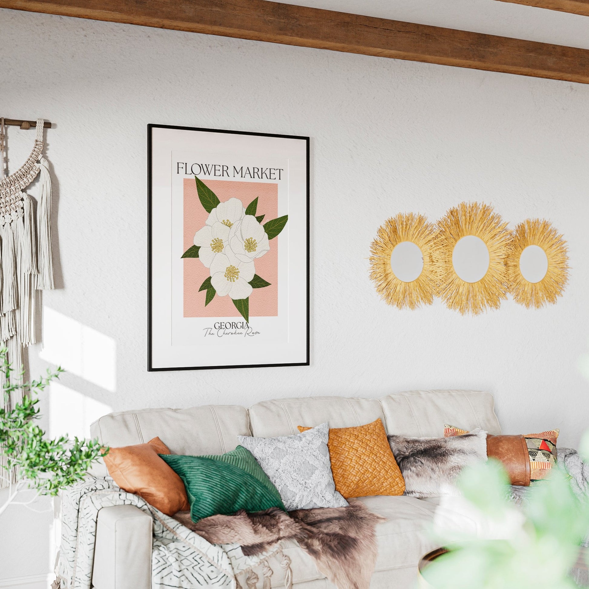 Express your love for Georgia and flowers with our Flower Market Georgia Art Print. This quirky art print features the state's beautiful flowers and a playful nod to the local flower market. Add a touch of whimsy to your home decor and show off your state pride with this unique piece.