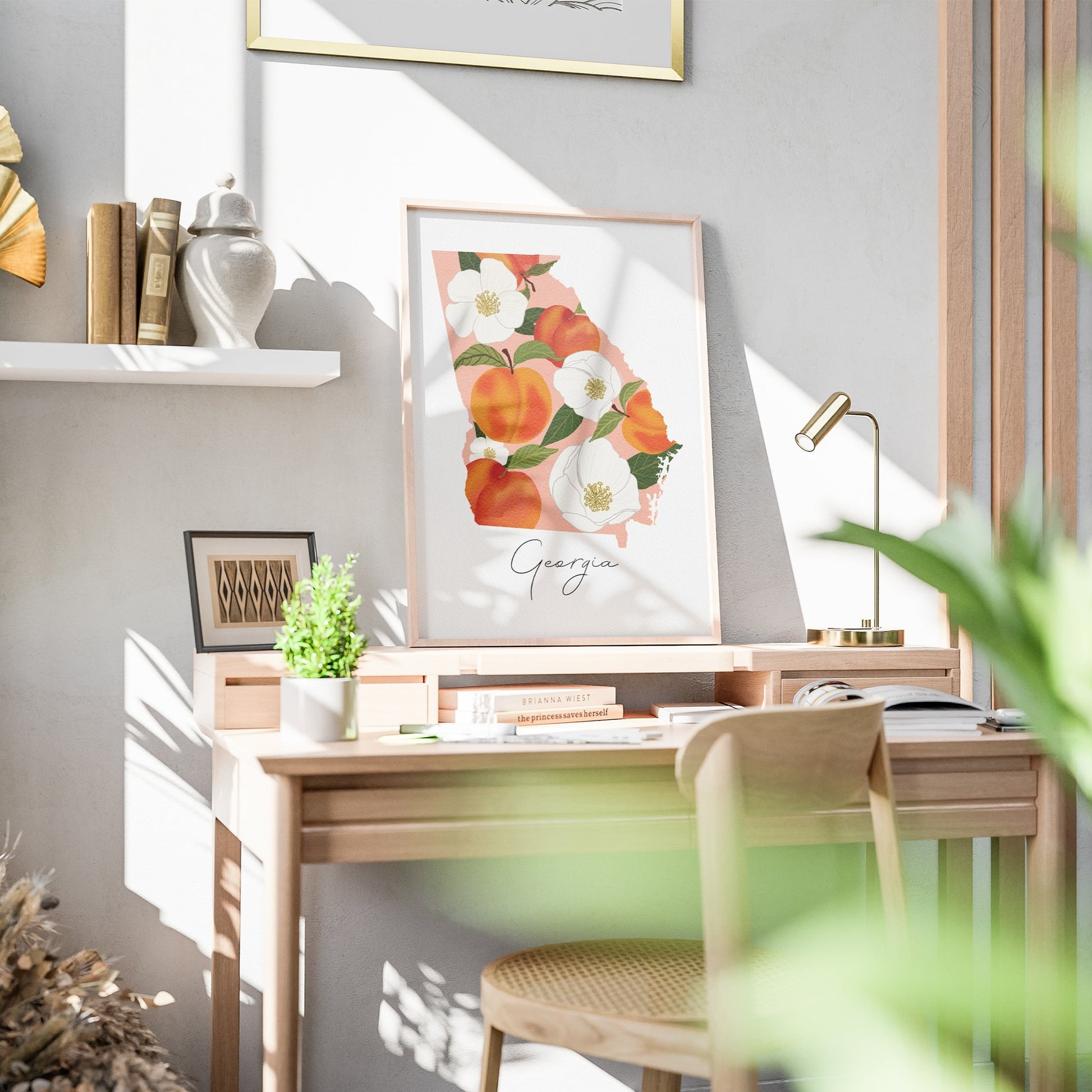 Get a taste of Georgia with this vibrant watercolor art print. Featuring the iconic peaches and state flower, it's the perfect addition to any wall. A fun and playful addition to your home decor. (Pun intended, peachy keen?)