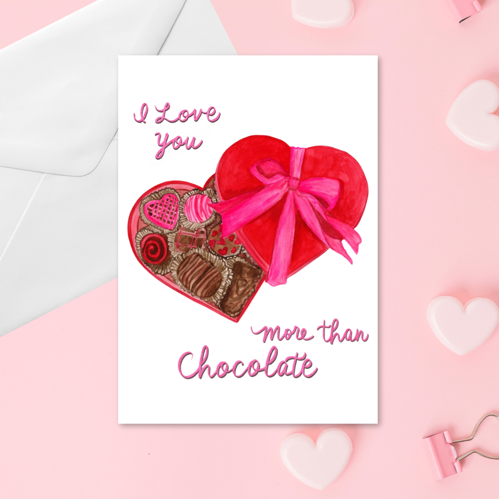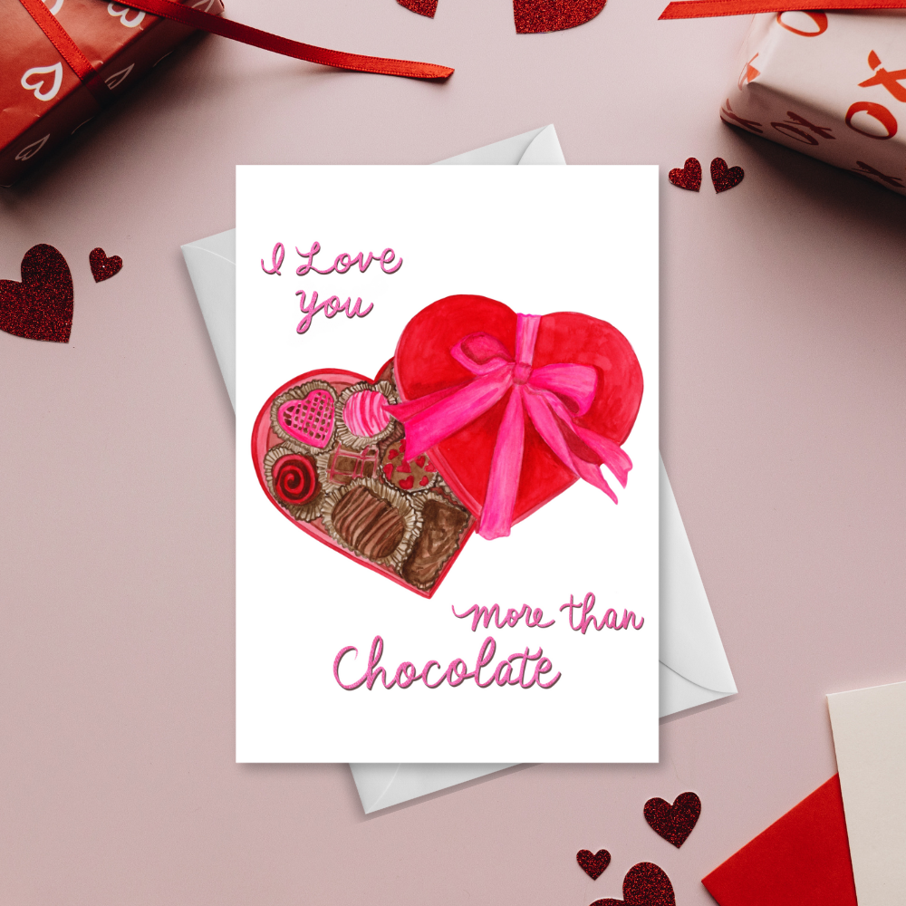 Express your love this Valentine's Day with our watercolor greeting card and a heart-shaped box of chocolates. Show them how much you care with the playful message, "I love you more than chocolate". It's the perfect way to sweeten up your loved one's day!
