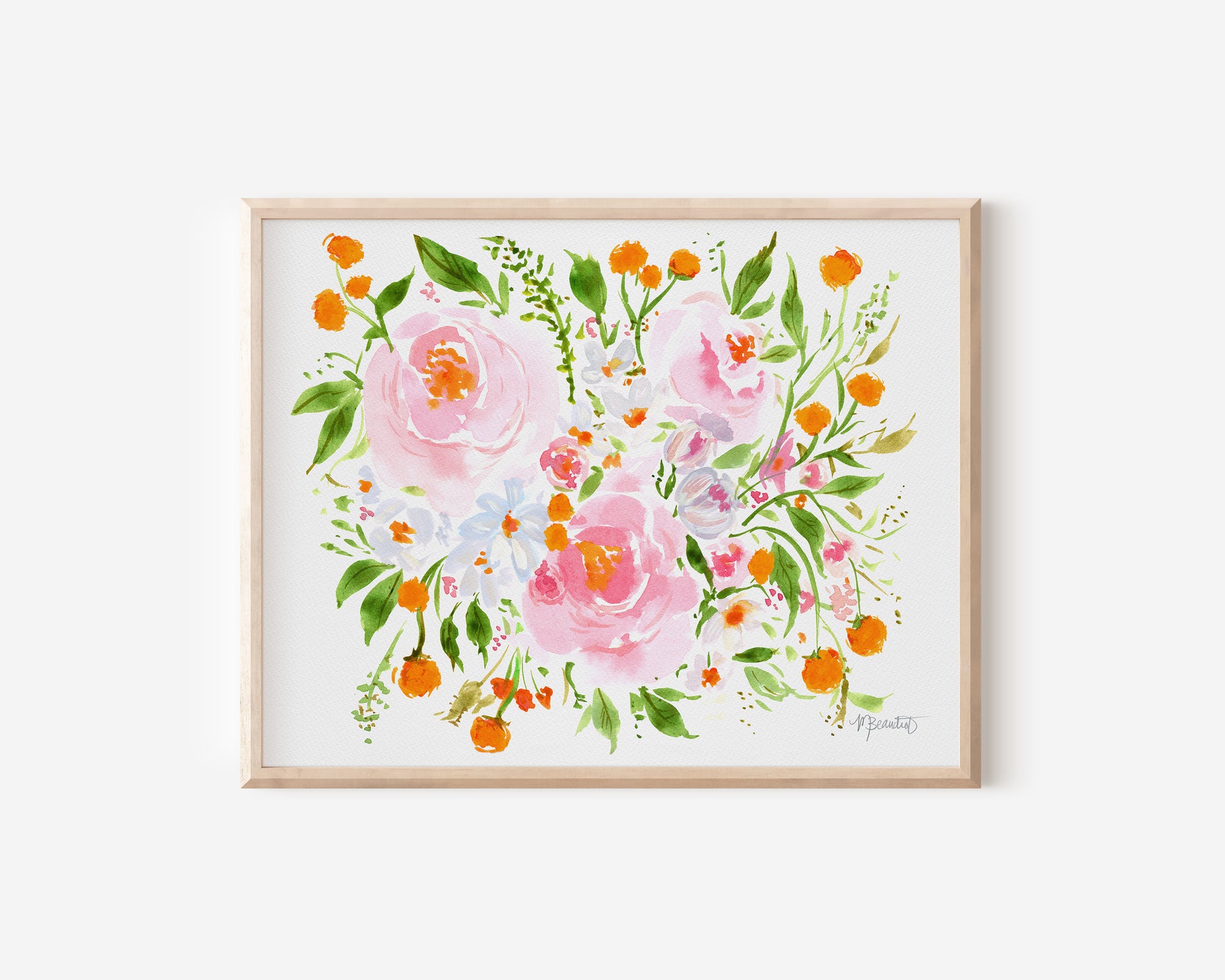 This loose watercolor floral painting is the perfect way to add a splash of vibrant color and life to any room. Soft blush roses and energetic bursts of orange with its soft brush strokes and use of light and dark shades, it can bring a sense of beauty and serenity to any space. It will be a beautiful addition to your home and is sure to bring a smile to your face every time you look at it.