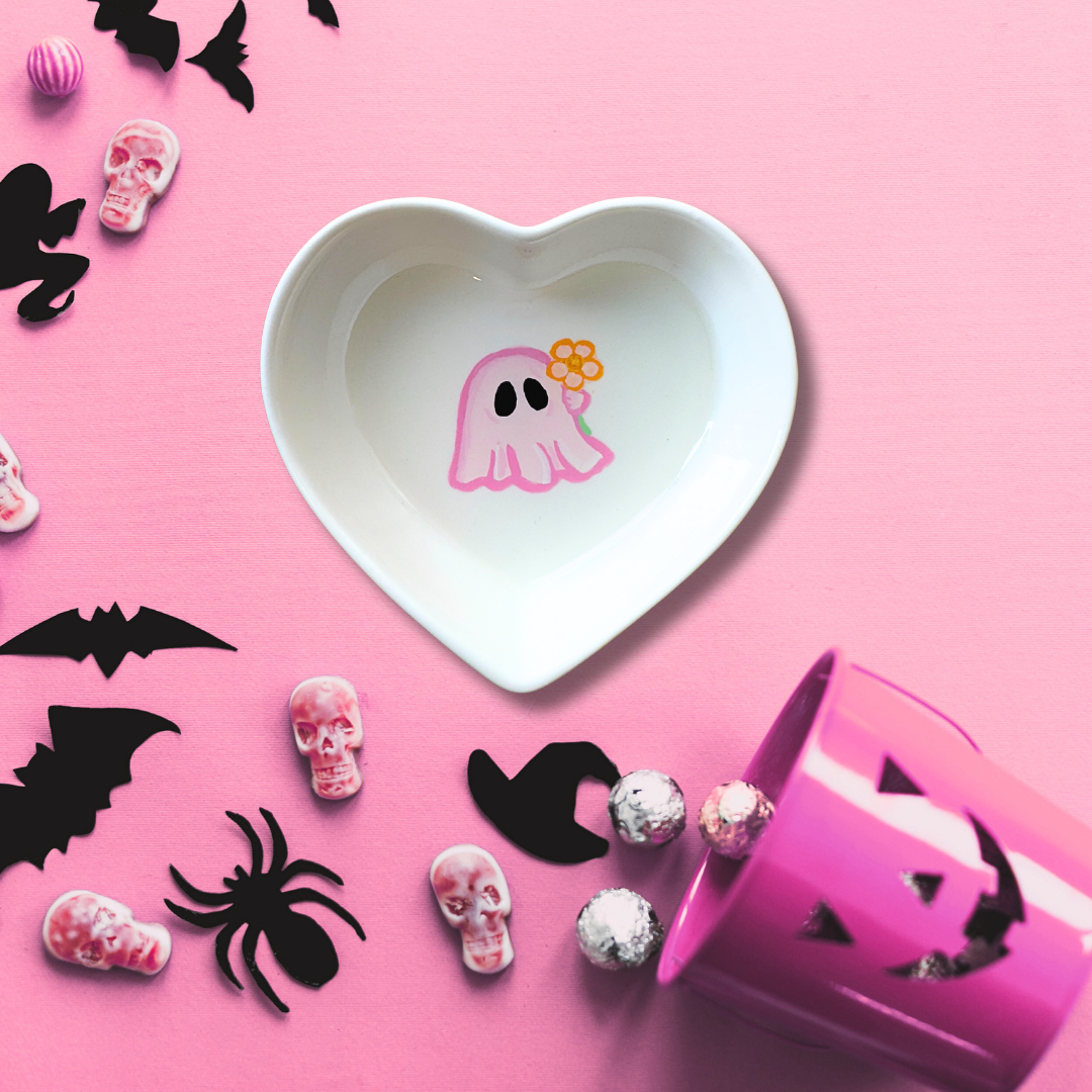 Indulge in the whimsical charm of our Pink Ghostie Trinket Dish. This hand-painted heart shaped dish features a cute pink ghostie holding a delicate flower, preserved with a glossy resin finish. Perfect for storing your small treasures and adding a touch of playful magic to any space.