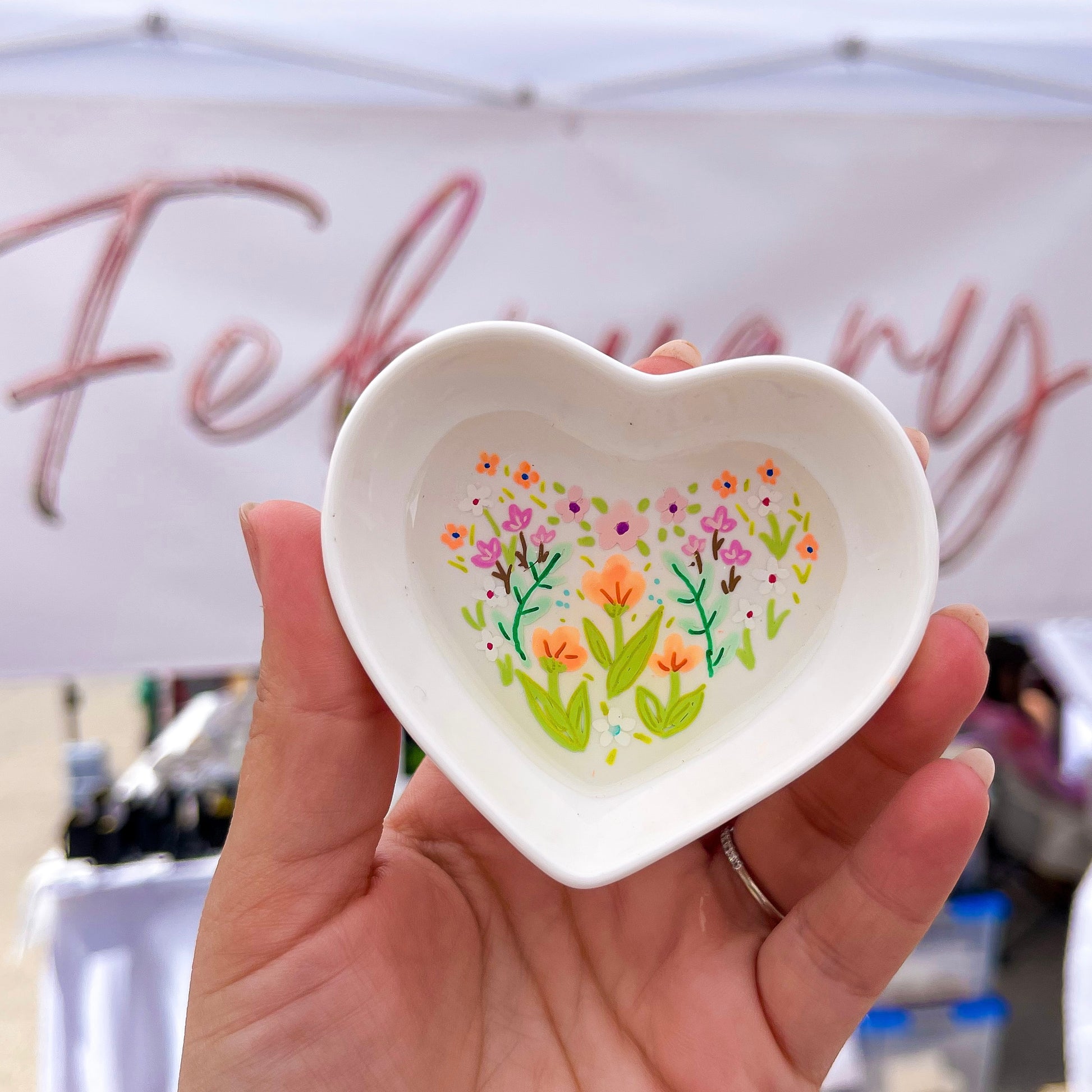 Introducing our Playful Florals Ceramic Dish - the perfect combination of s Keep your trinkets and jewelry organized in this heart-shaped dish, hand-painted with a beautiful rose pattern. The sealed resin adds a long-lasting shine. Perfect for storing rings, earrings, gemstones, and more.