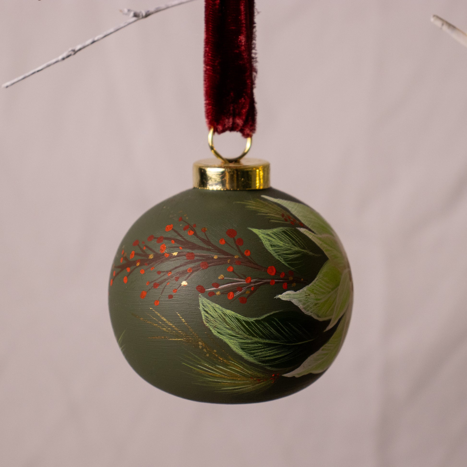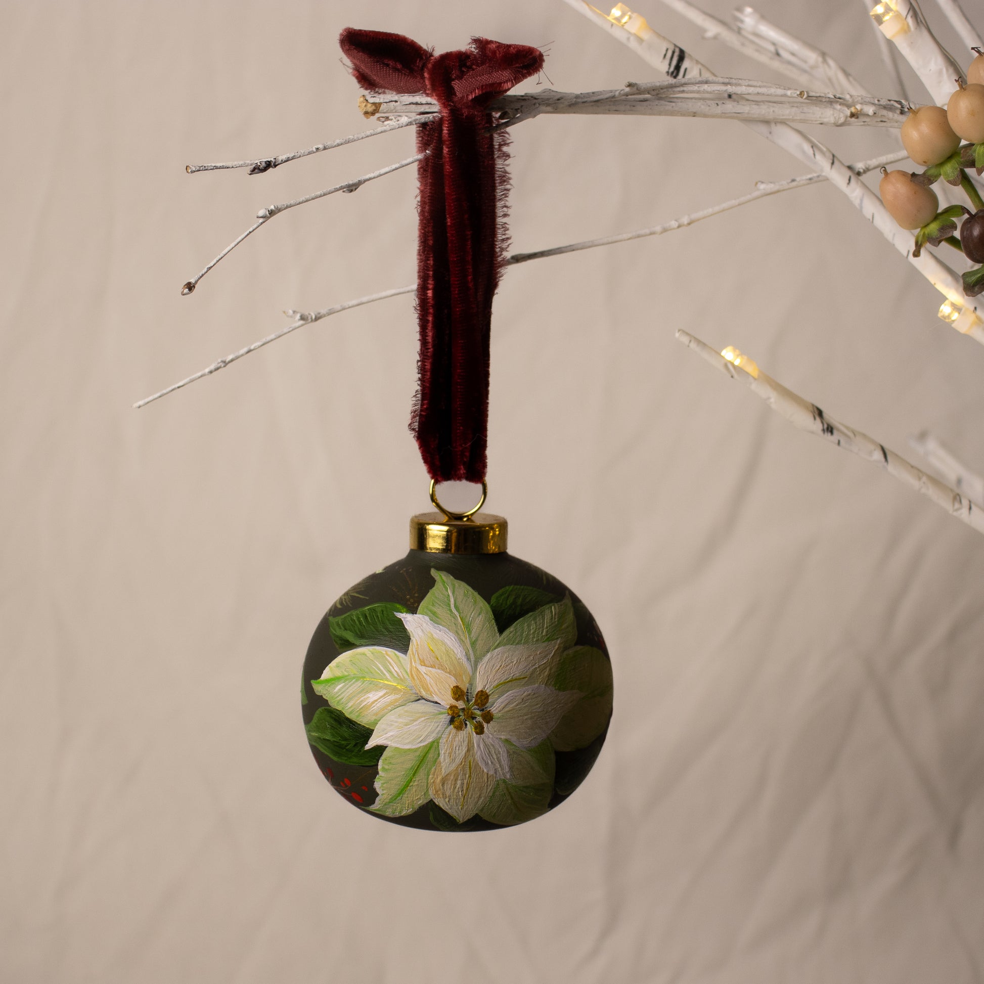 Introducing our luxurious Poinsettia in Verte Round Shaped Ceramic Ornament. The delicate White Poinsettias, elegant Winter Pine & Berries in rich Verte, and shimmering gold metallic touches make this ornament truly unique. Each one is hand painted to create an heirloom piece, finished with a Deep Scarlet Velvet Silk Ribbon. Elevate your holiday decor with this exclusive piece.