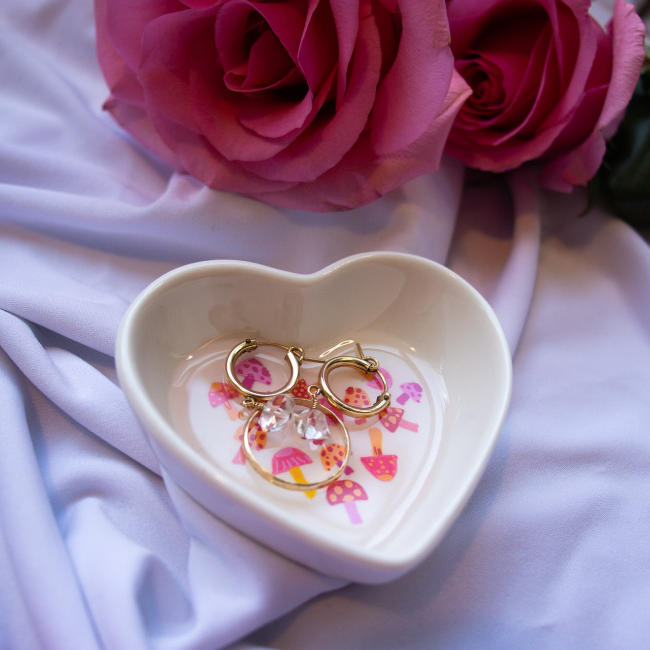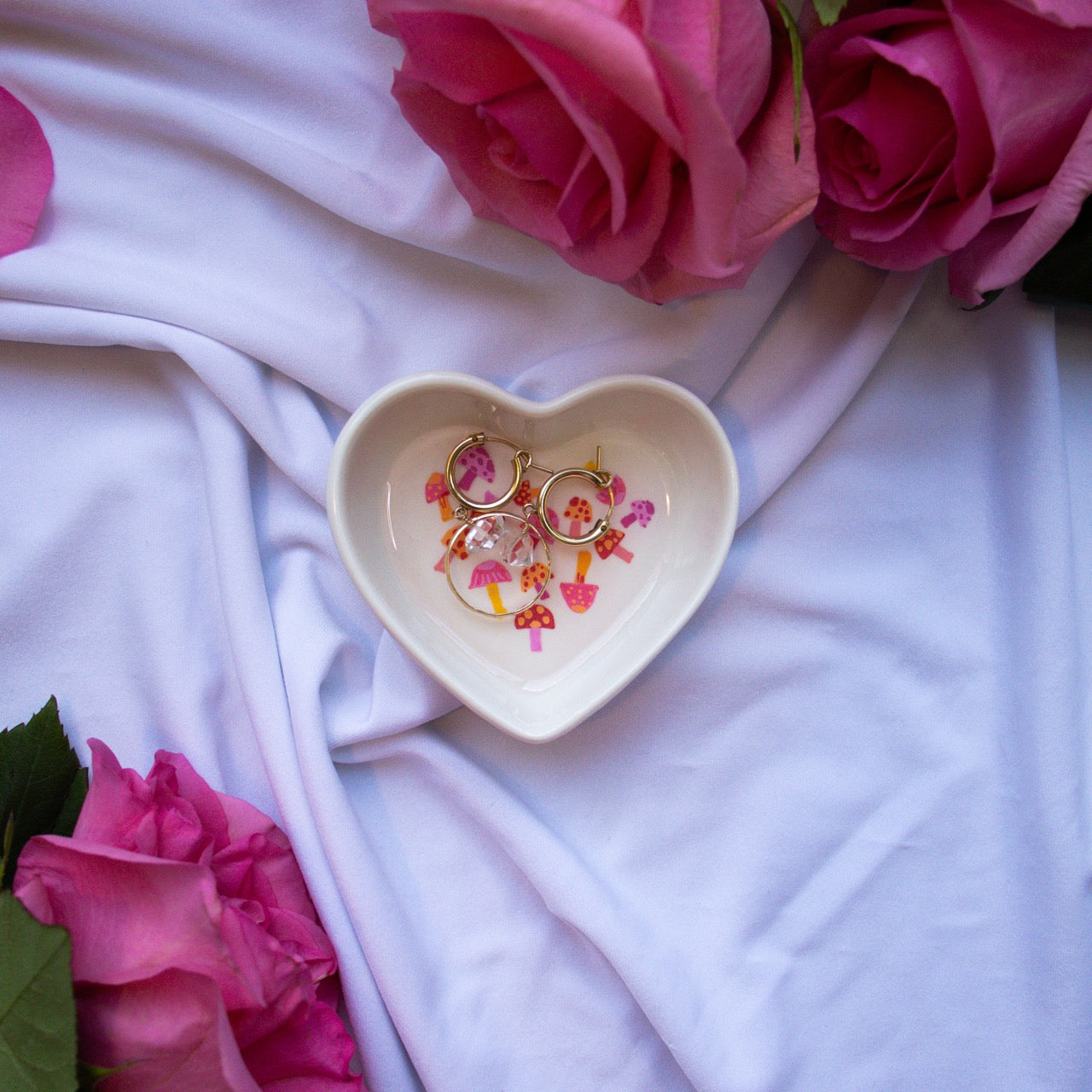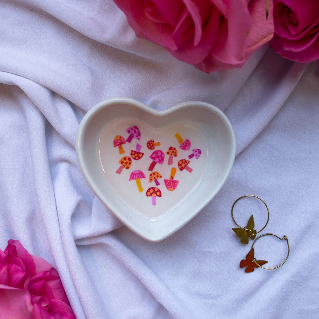Secure your small treasures and baubles in style with our playful Retro Mushrooms Ceramic Trinket Dish. Adorned with vividly-painted mushrooms in shades of pink, orange, and red, this heart-shaped dish is coated with resin to ensure long-lasting durability. An ideal way to store crystals and other little knick-knacks, this charming dish adds a dash of whimsy to any corner.