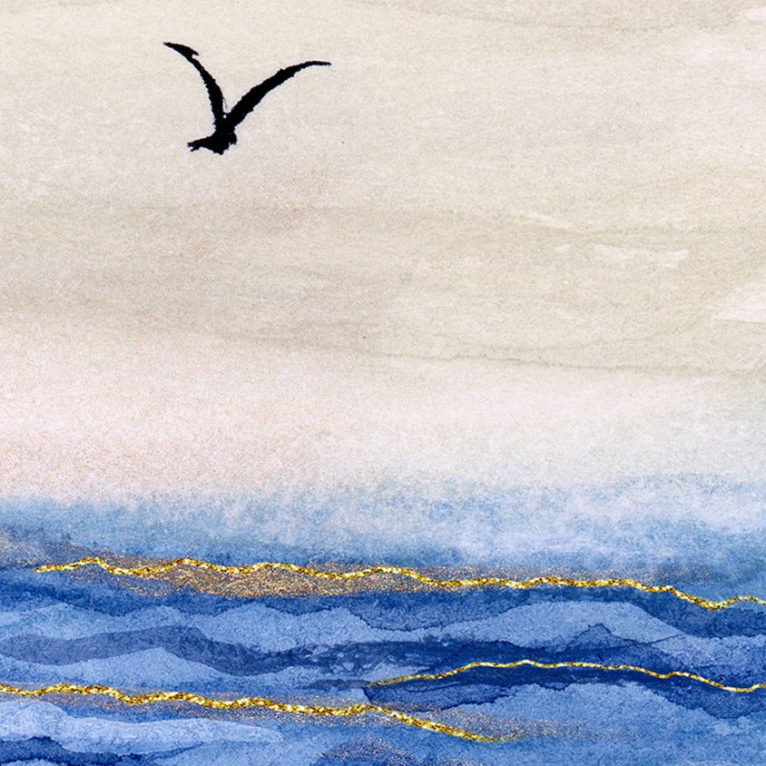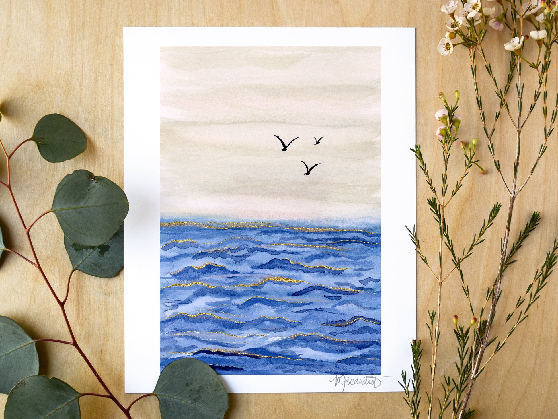 This beautiful watercolor painting captures a moment of nostalgia for home. Hues of blues portray the peacefulness of the ocean. The painting should give the viewer a sense of calm as they are taken away by the gentle waves and lulling seascape and seagulls flying into the horizon. The movement of the waves and the depth of the blues create a tranquil atmosphere that is sure to bring a feeling of nostalgia and peace. This painting is a reminder of the beauty of the ocean and the calming effects it can bring to all of us.