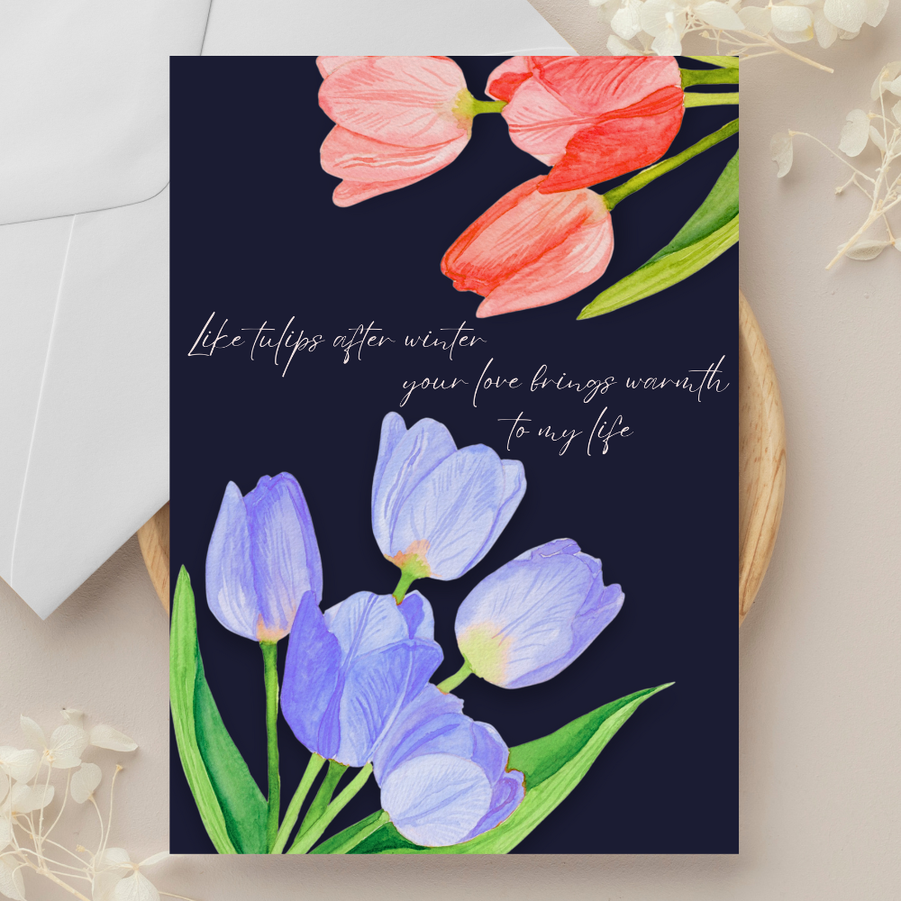 Tulips In Winter Anniversary Multi Color In Navy Valentine's Day Greeting Card