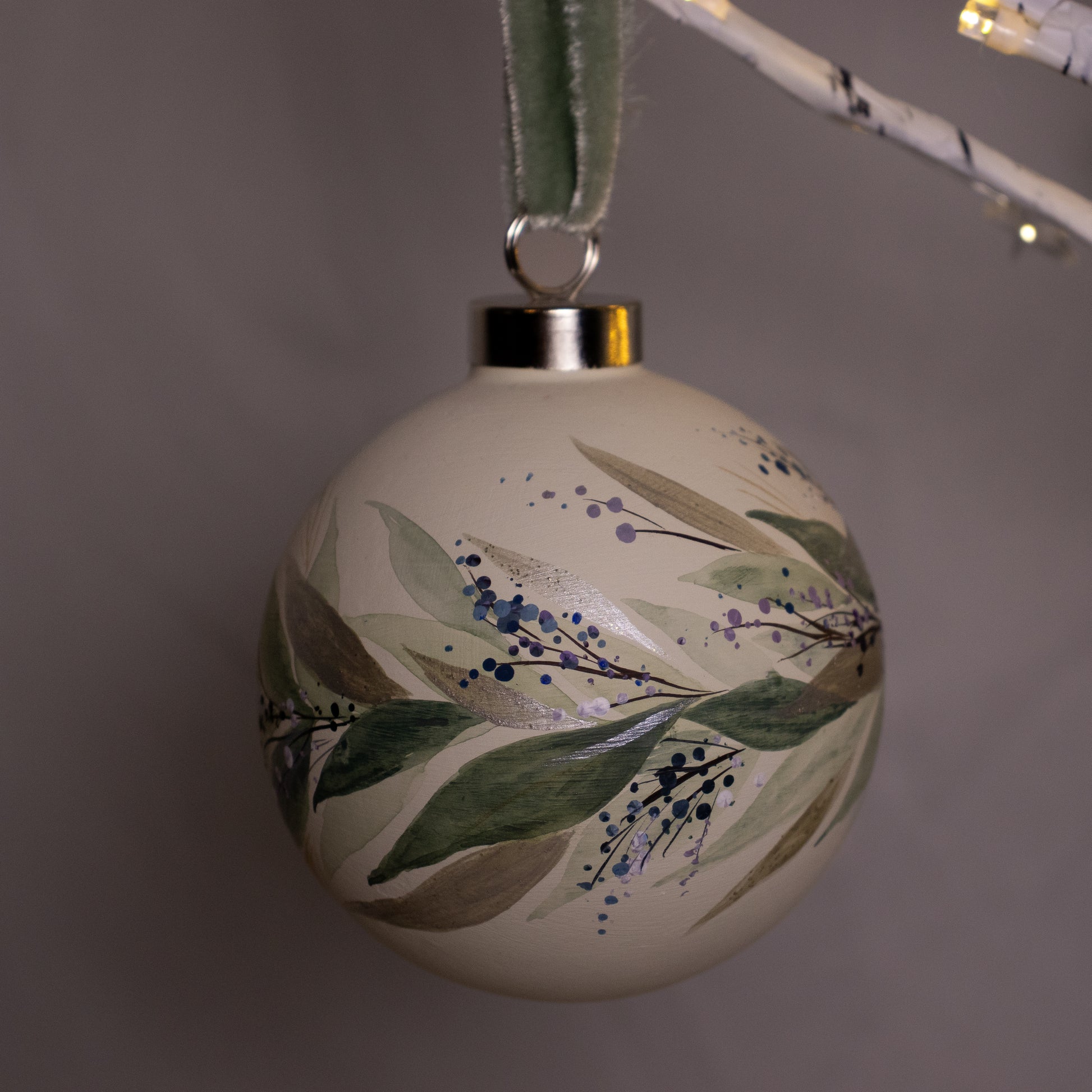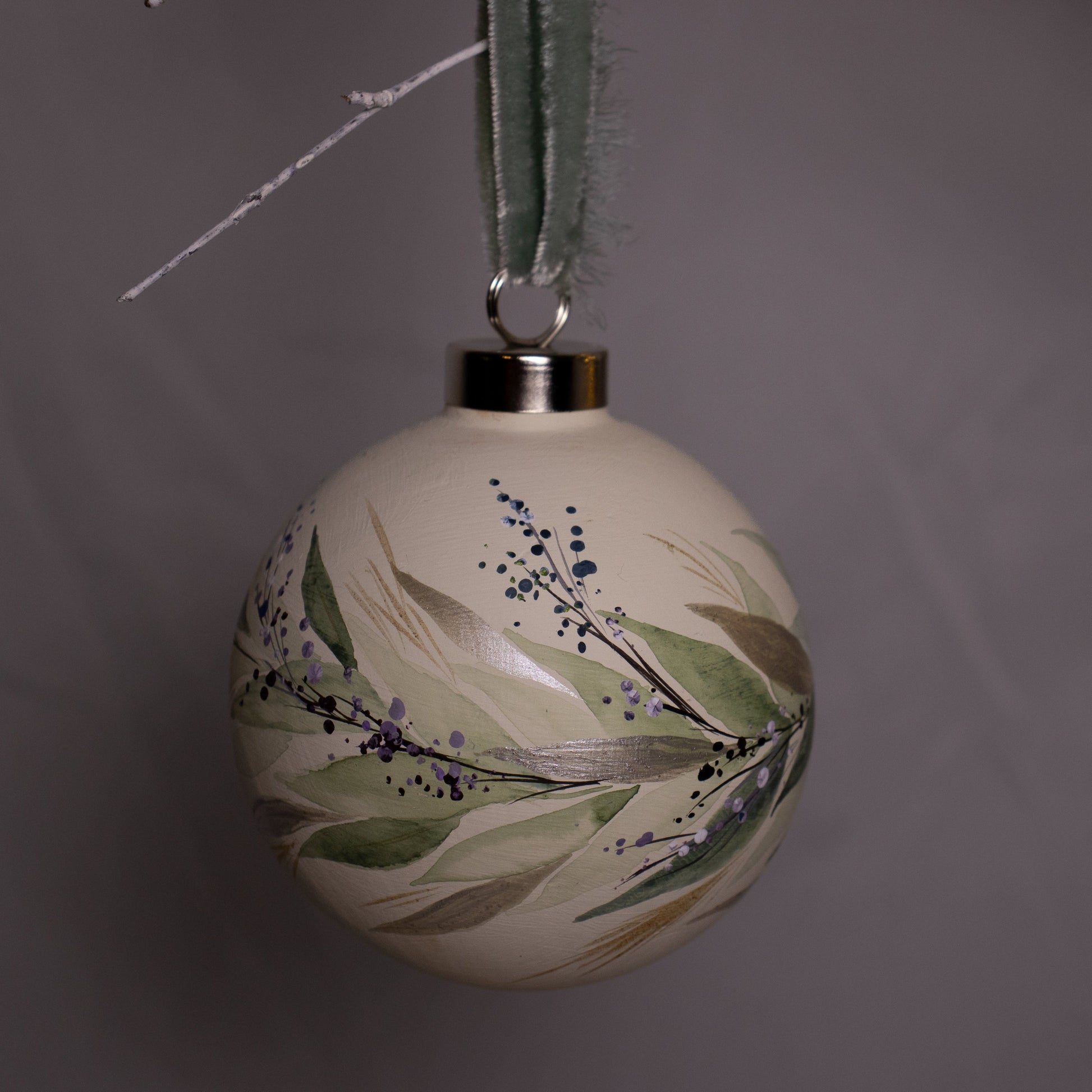 This heirloom ornament from Winter Sage Botanicals features a unique, hand-painted design of loose botanicals and winter berries, accented with gilded leaves and silver. Made with light vintage sage velvet ribbon for a touch of elegance. Each ornament is one-of-a-kind, making it a special addition to your holiday decor.
